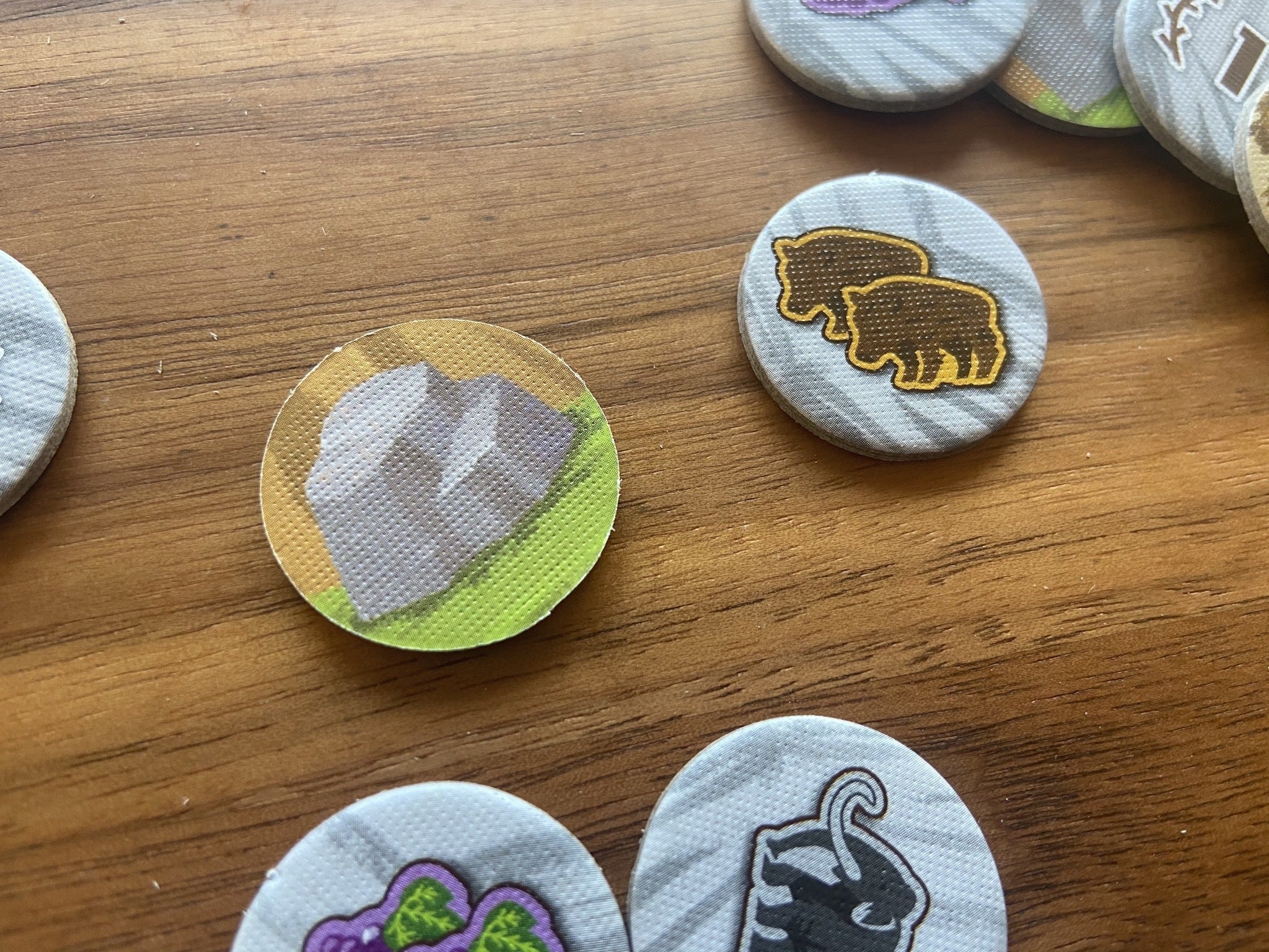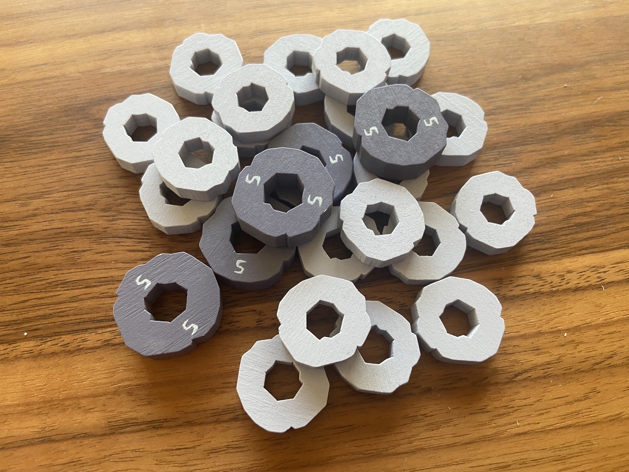 石貨トークンは、不足してほしくないため、ルールブックの表記より少し多めに入っています。1石貨には印刷はありませんが、中央をくり抜いたものとなります。