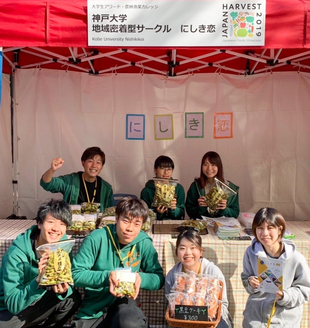 黒枝豆を味わい、農業ボランティアを通して黒枝豆の生産過程を経験したメンバーは黒枝豆の大ファンです。その黒枝豆の魅力を多くの人に届けたいという思いから地域の耕作放棄地をお借りして、黒枝豆を生産しています。生産した黒枝豆は神戸や大阪でマルシェに出店し、メンバー自ら販売を行っています。