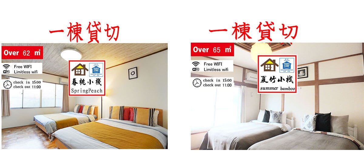 夏竹小桟は大阪市生野区小路3丁目にあります。地下鉄駅より歩いて5分程度到着できます。館内全域に無料Wi-Fiを提供しており、スピードの制限はございません。広さは65平米で、2階にダブルベッドが2、ダブル布団ベッド2を用意しており、1階にシングル布団ベード3つまで用意できます。最大大人11名、3歳未満の子供2名はお泊りできます。独立したキチンルームにて電子レンジ、冷蔵庫、ポット等もありますし、お風呂とトイレ別々で、洗濯機も用意しています。