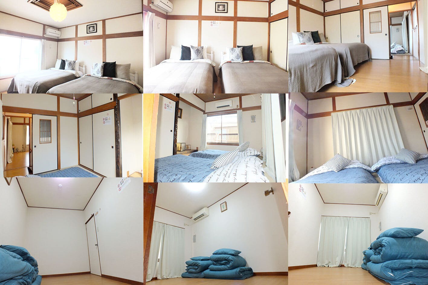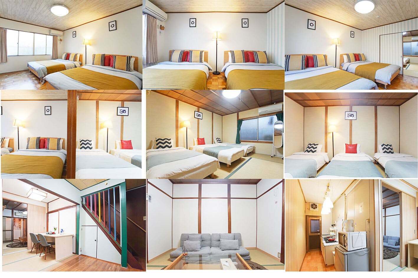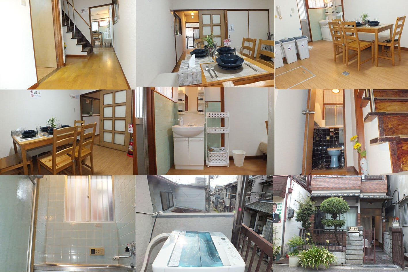 広さは62平米で、2階にてベールルームはあり、ダブルベッドが2、シングルベッドが3があります。1階にてソファーベッドが2つあります、最大大人9名、3歳未満の子供2名はお泊りできます。独立したキチンルームにて電子レンジ、冷蔵庫、ポット等もありますし、お風呂とトイレ別々で、洗濯機も用意しています。徒歩2分以内コンビニがあり、5分以内今里新道商店街があり、回転すし、居酒屋、定食屋さんなどおみせがたくさんあります。ドラックストア、100円ショップ、スーパーなどお買い物も便利です。
