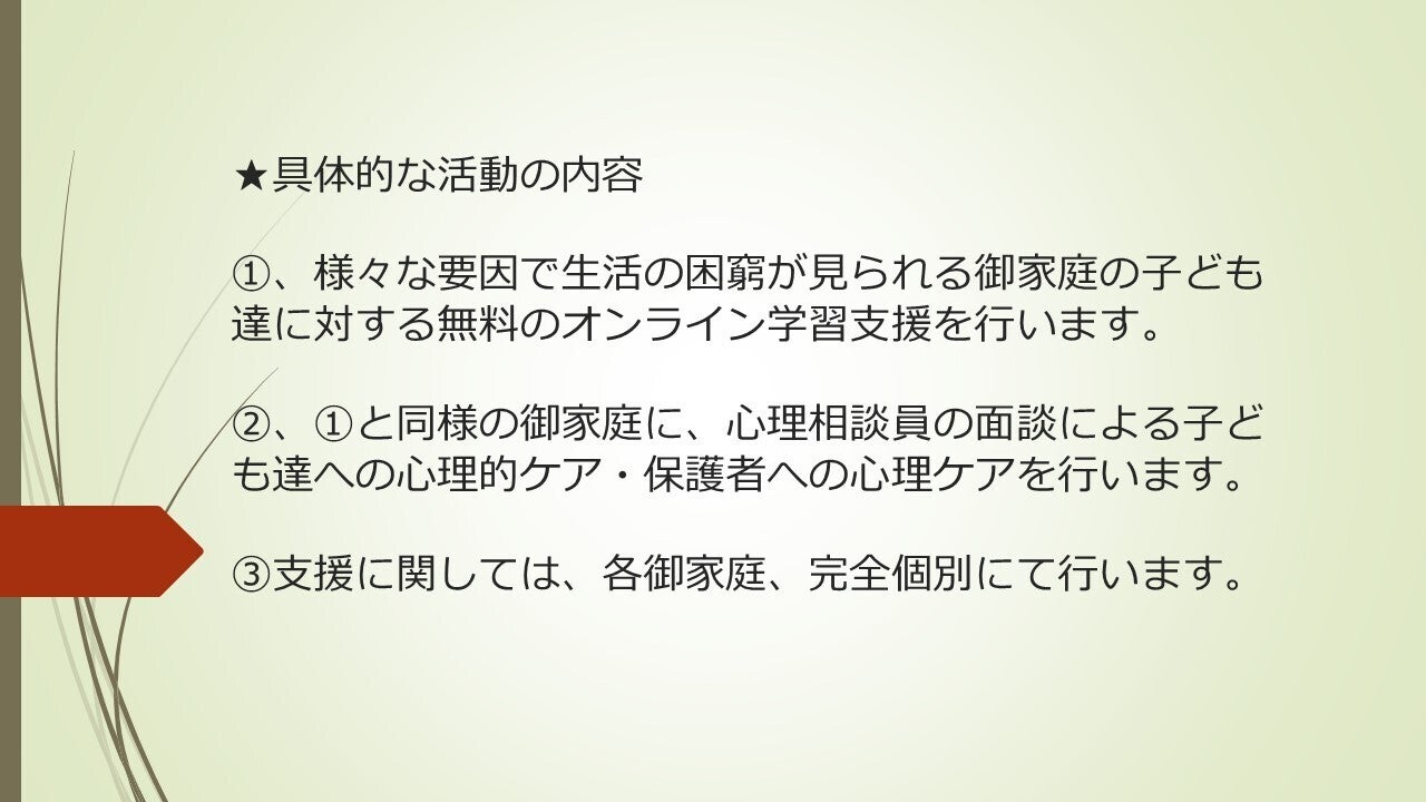 そこで、このプロジェクトでは、子ども達への支援はもちろんの事、オンライン面談等を通して、保護者の方々のご負担を少しでも軽減できればと思っております!