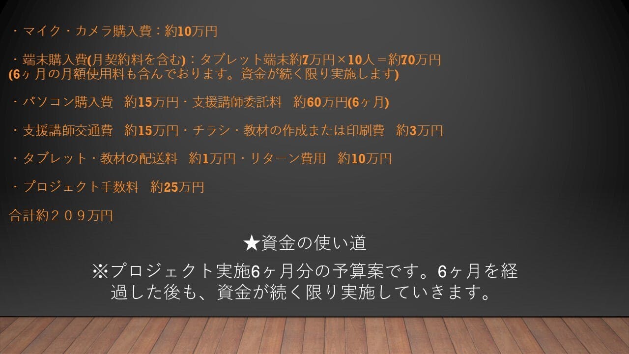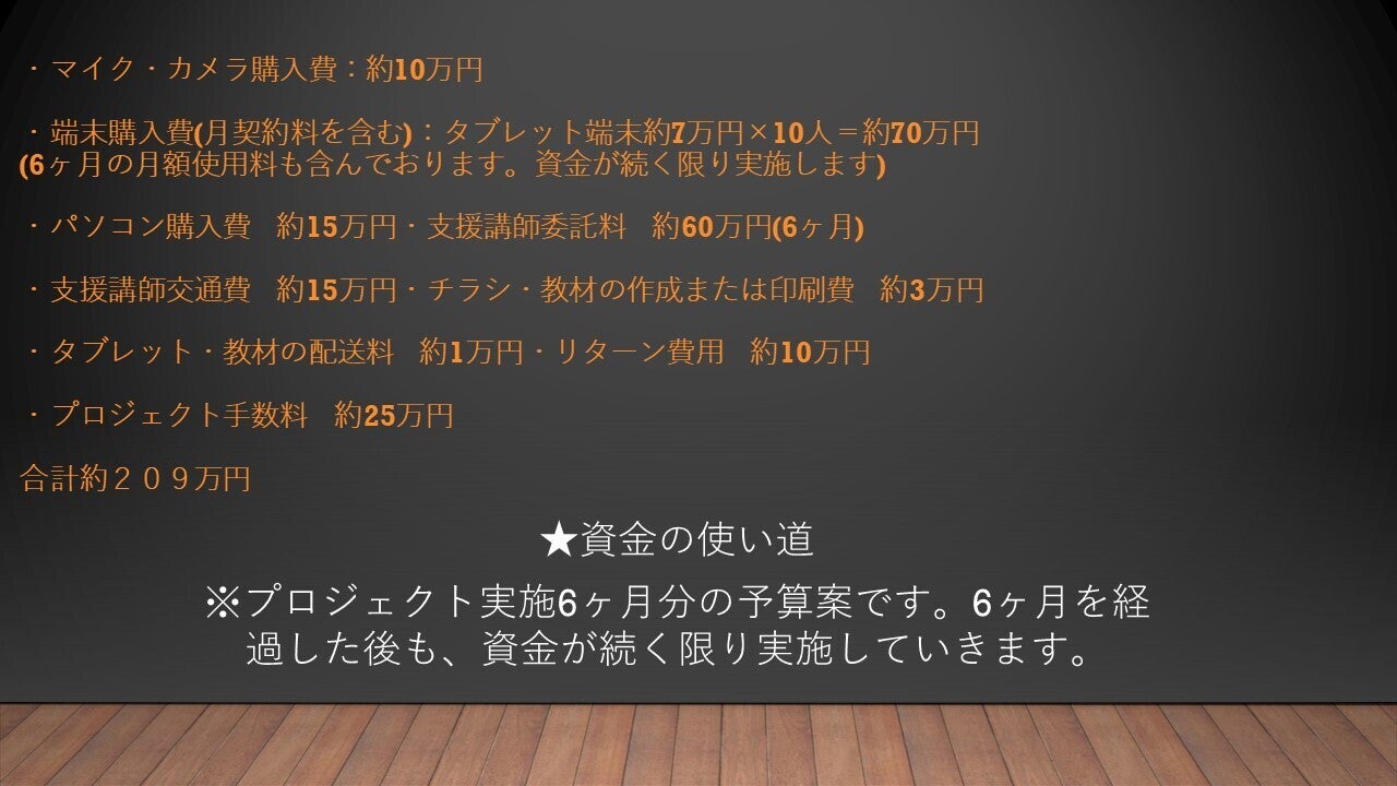 ※ただし、支援金が目標金額に届かない場合は、その金額に応じて可能な限りのプロジェクトの実施になります。何卒ご承知の程お願い申し上げます。