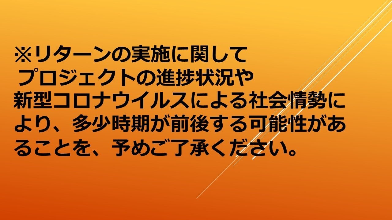 ・2021年3月頃大阪府内にて開催予定の(新型コロナウイルスの状況により日程変更の可能性あり)プロジェクト報告会、支援者懇親会へ参加可能(交通費 滞在費 御本人様御負担)