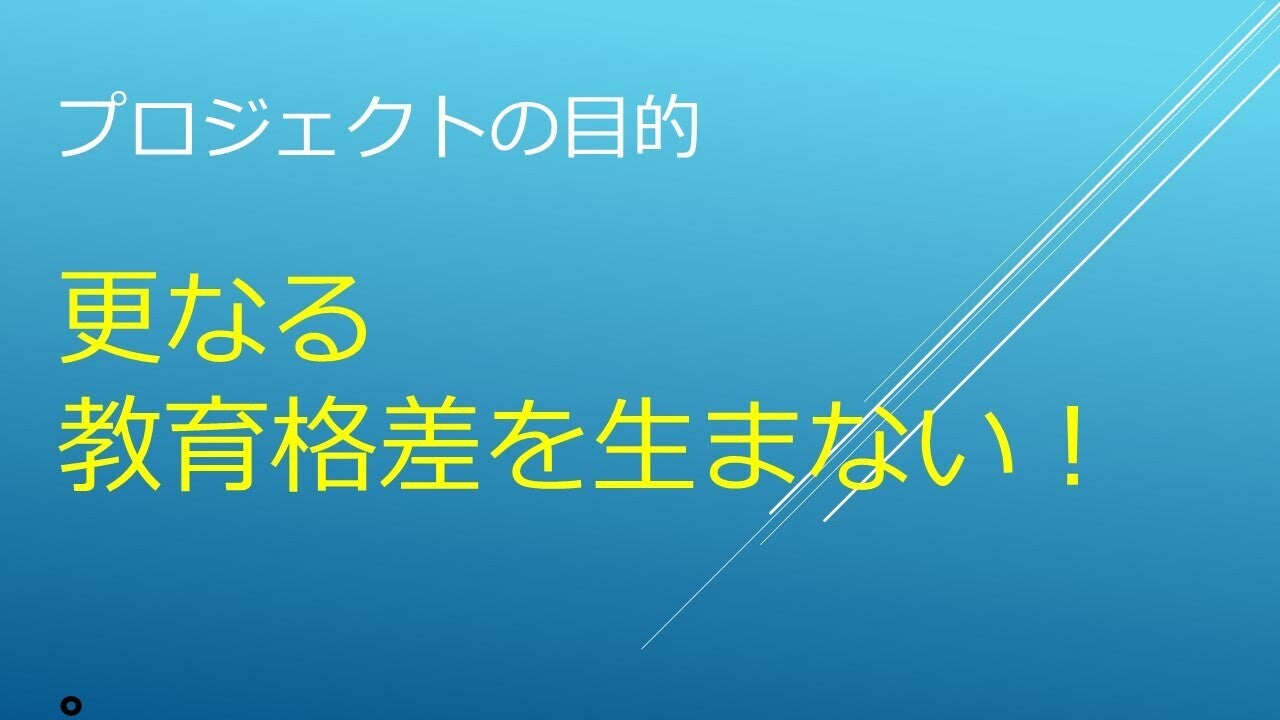 しかし、これらは更なる教育格差を生み出すとの懸念もあります。この更なる教育格差を生まない事が、今回のプロジェクトの目的です。