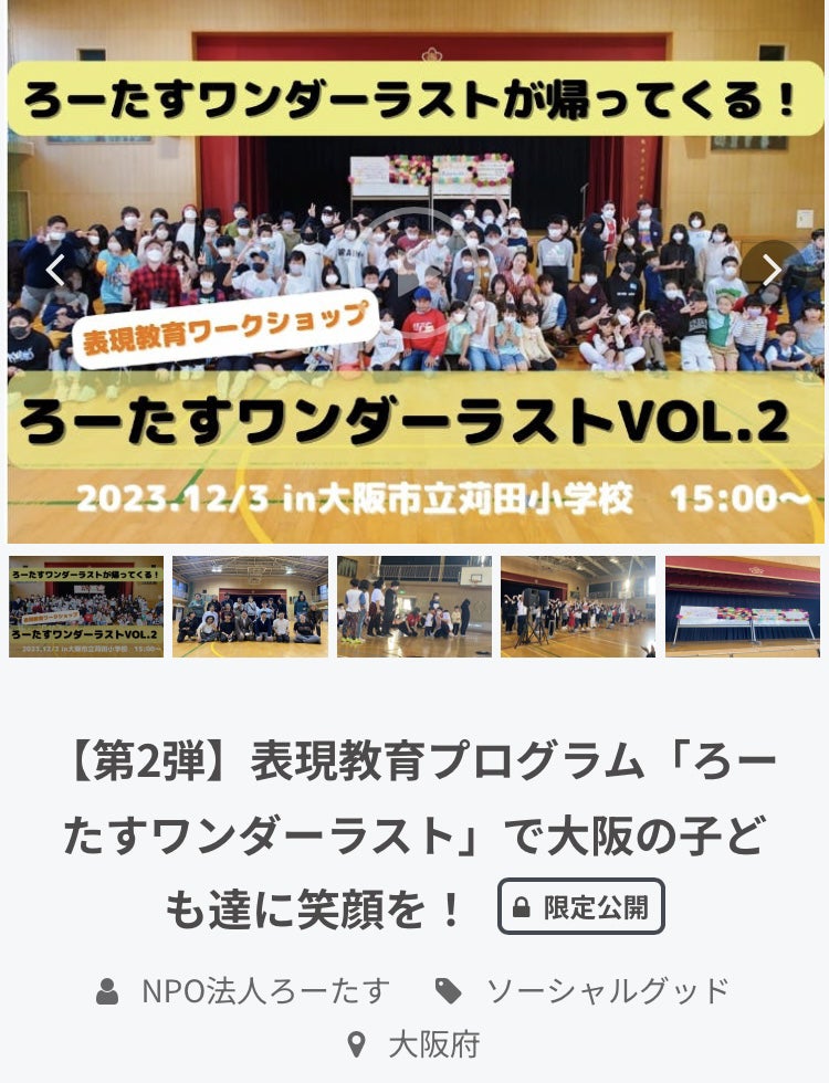 2023/09/30 09:00この後10時より、『ろーたすワンダーラストVOL.2』のクラウドファンディングがSTARTします!!!【クラウドファンディングプロジェクトページ】https://camp-fire.jp/projects/view/697830?utm_campaign=cp_po_share_c_msg_mypage_projects_show子ども達が『私って素敵なんだ!』と自信を持って生きる事のできるお手伝いを、お願いします!!SNSでの拡散・ページへのお気に入り登録(ハートマークをクリック)も、とても有難いです!どうぞ、宜しくお願いを申し上げます!!! もっと見る