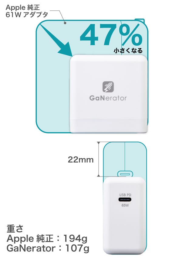 Better DiGiは情熱にあふれたチームです。 ウルトラスリムモニター(Xcreen2go)でたくさんのファンを獲得し、2018年から軽量・コンパクトな製品デザインに注力しています。 我々は新しい技術とアイデアを組み合わせて素晴らしい製品を作り上げるのが大好きです。 チームのメンバーも、他のMacBookユーザーと同様の悩みを持っていました。 Apple純正の充電器がとても大きく重すぎるという問題です。 我々は長年のGaN技術開発によって出力をよりパワフルに、サイズをより小さくすることに成功しました。 この小さくパワフルな製品はクレジットカードの半分の大きさ(51mm×26mm×51mm)しかなく、65ワットであなたのMacBookを高速に充電し続けます。 我々はこの製品を「GaNerator」と命名しました。