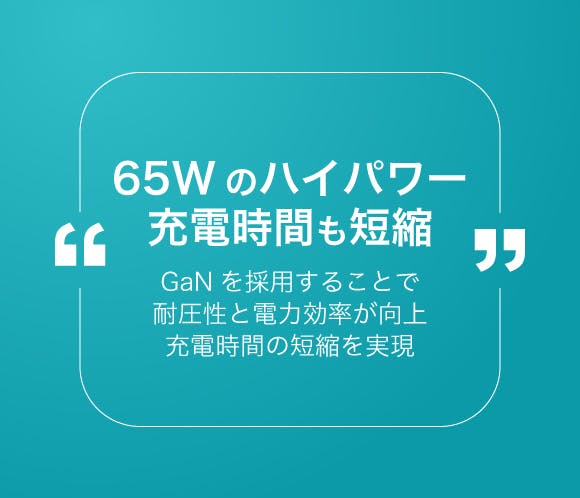 従来のシリコンよりも耐圧性と電力効率が高いこの素材。当製品では充電器のスイッチ部分に使用することで発熱のリスクを抑えることができるようになりました。 結果として、高出力をキープしつつ従来より軽量小型化を実現することができました。 電力損失も抑えられるためエネルギー効率を改善できます。