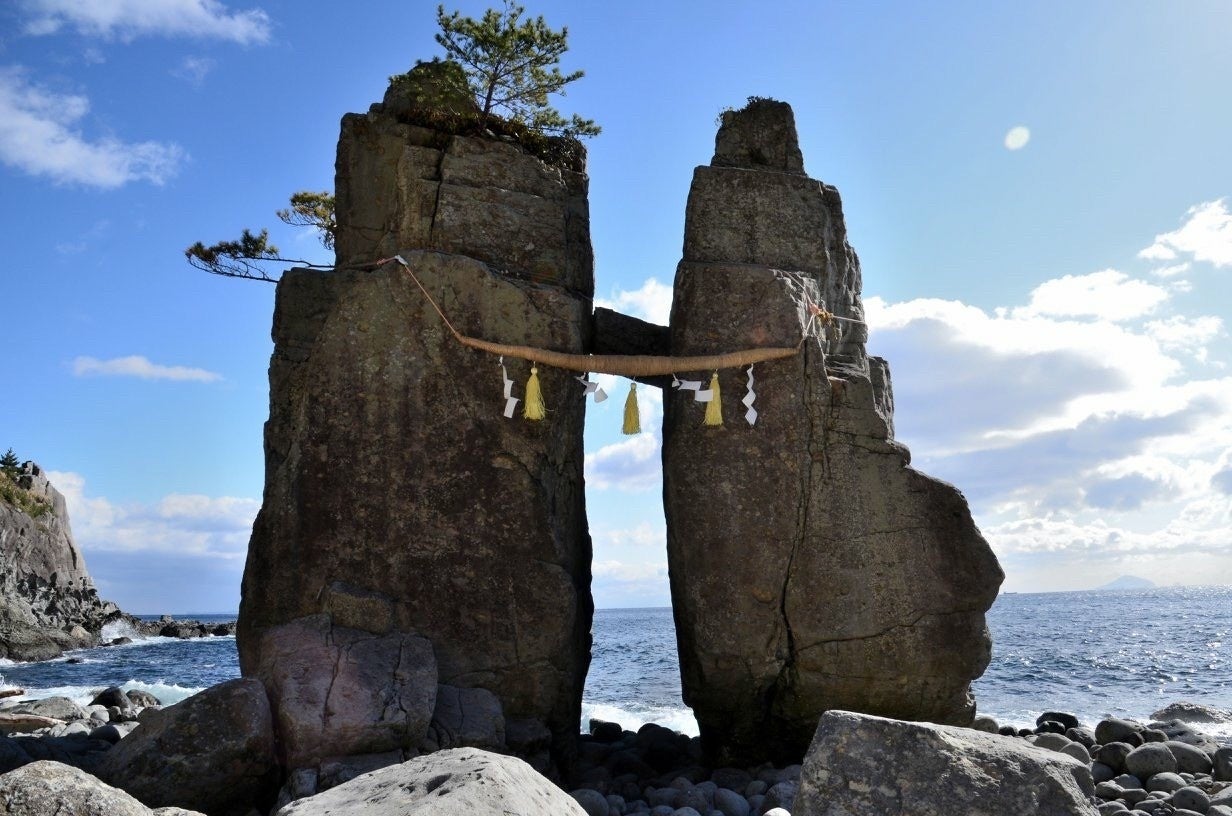 この争いを見かねた天城山の天狗が石を運び、間に石をはさんで争いをおさめたという伝承が残っています。20万年前頃まで活動していた天城火山の溶岩が波の浸食をうけ、大きな二つの岩が小さな岩をはさみこむ奇岩を作り出しました。※陸からは困難なため稲取漁港から出ているクルージングで見ることができます。