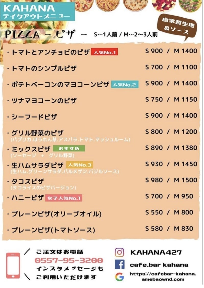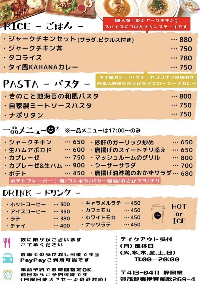 カハナはテイクアウトも充実しております。現在もテイクアウトは可能ですのでメニューはこちら。