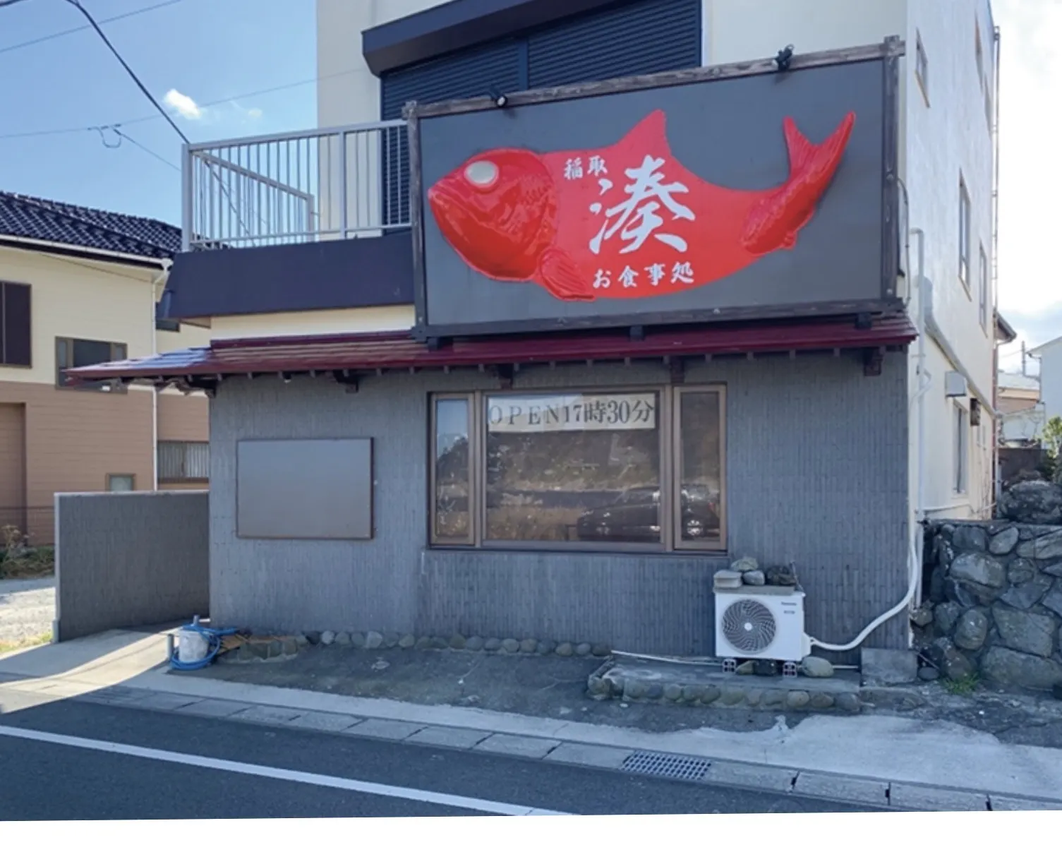 場所は駅から港までまっすぐに歩き、稲取港を沿うように歩いていくと大きな金目鯛のモチーフがあるところが湊です!