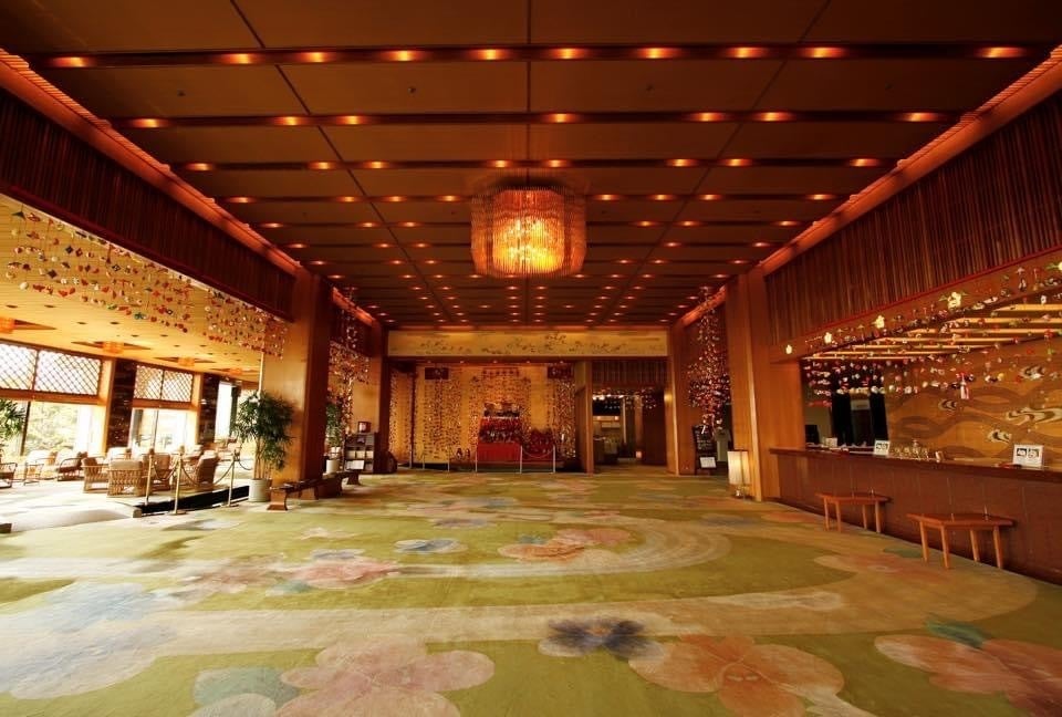 雛の吊るし飾りに囲まれた圧巻のロビーには四季折々のディスプレイと館内に流れている池に沢山の鯉が楽しめます。