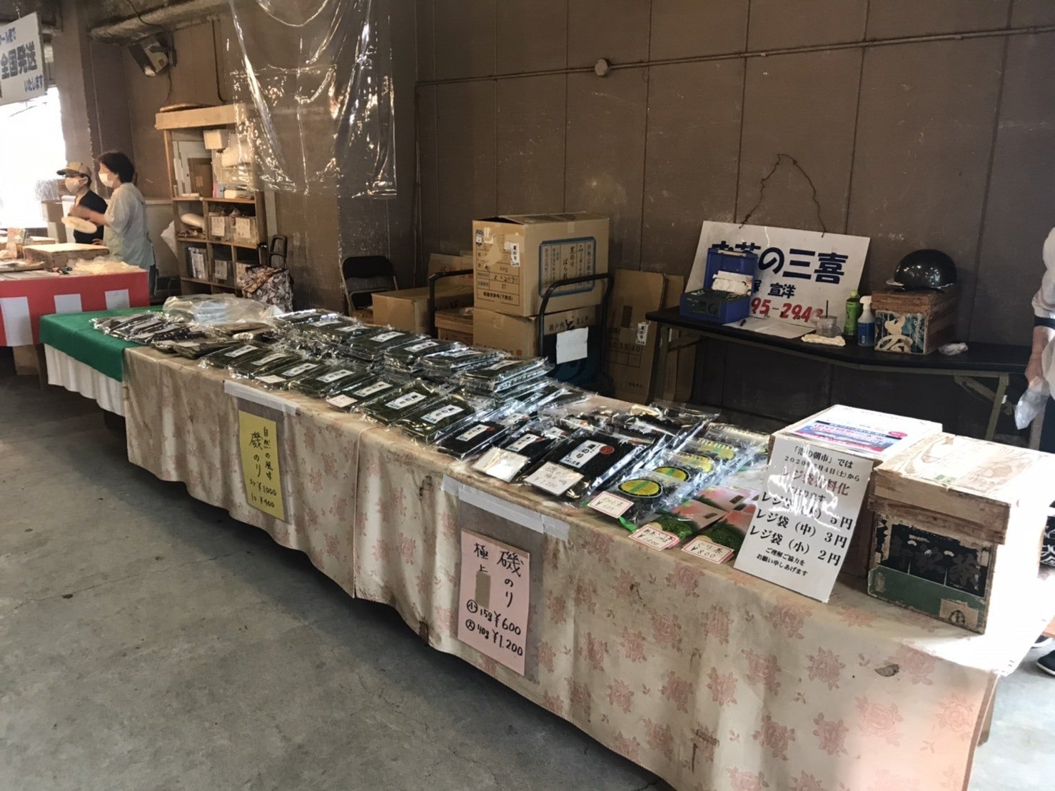 朝市でご購入された方も多いかと思いますがお茶と地海苔の販売をしております。無料のお味噌に入れてくれたりしますよー。