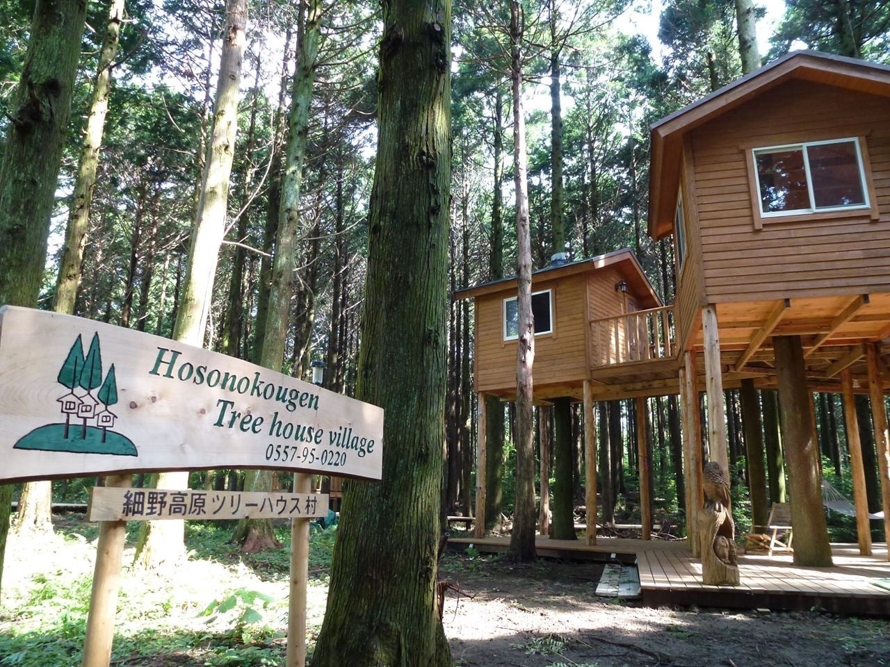 また併設している細野高原ツリーハウス村キャンプ場は日本で唯一ふくろうや鷹と遊べるキャンプ場です。ふくろうや鷹を手に乗せて記念撮影をしたり、フライトショーなどご覧いただけます。鳥の他にもやぎ・うさぎ・猫とたくさんの動物たちと触れ合えます。海までは車で15分、細野高原までは歩いて3分です。