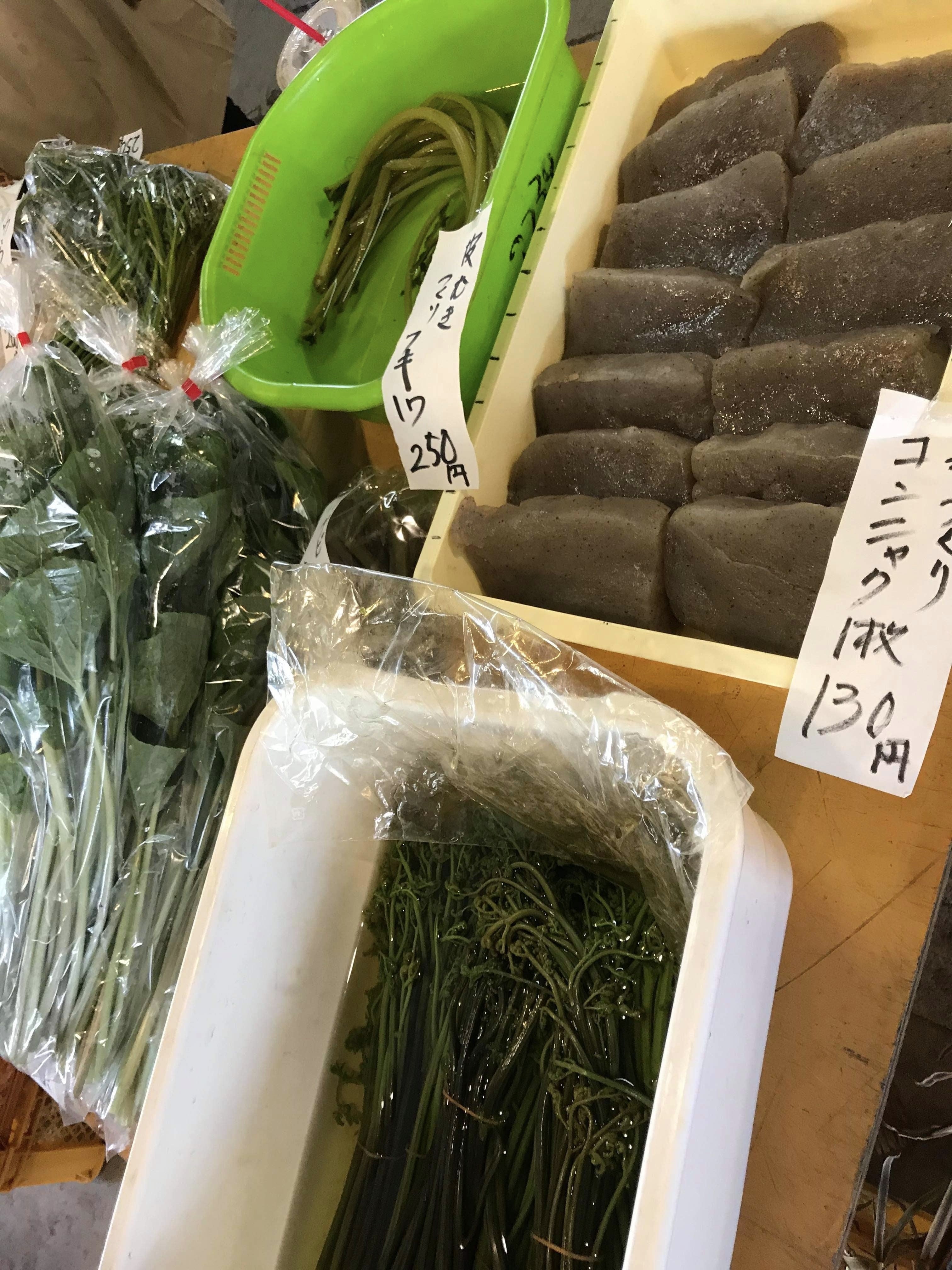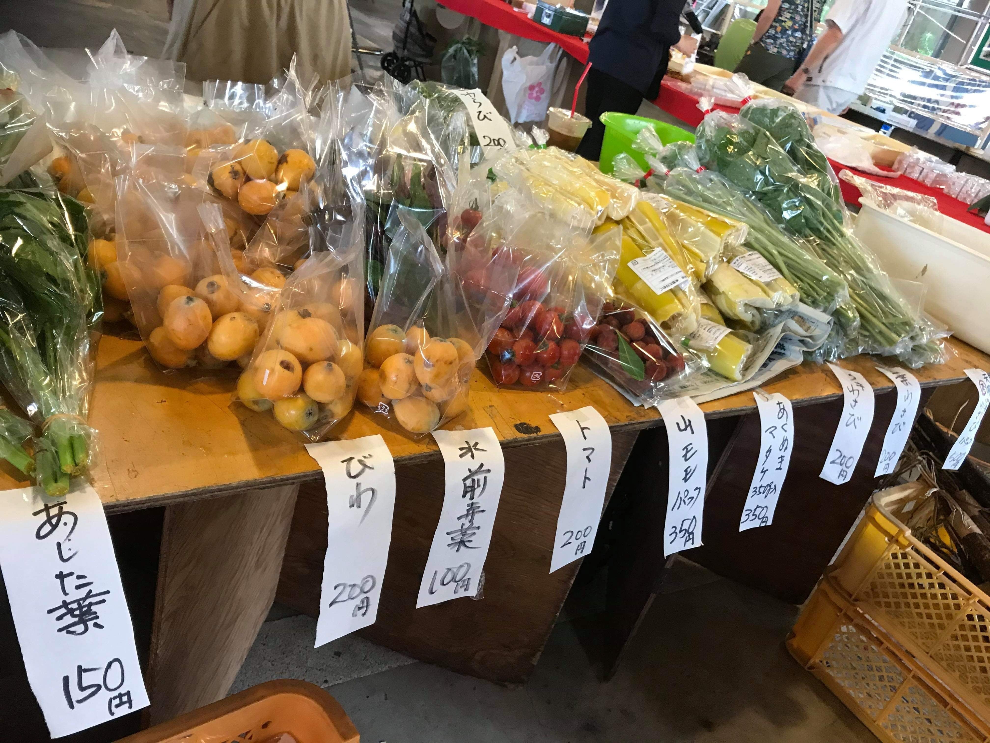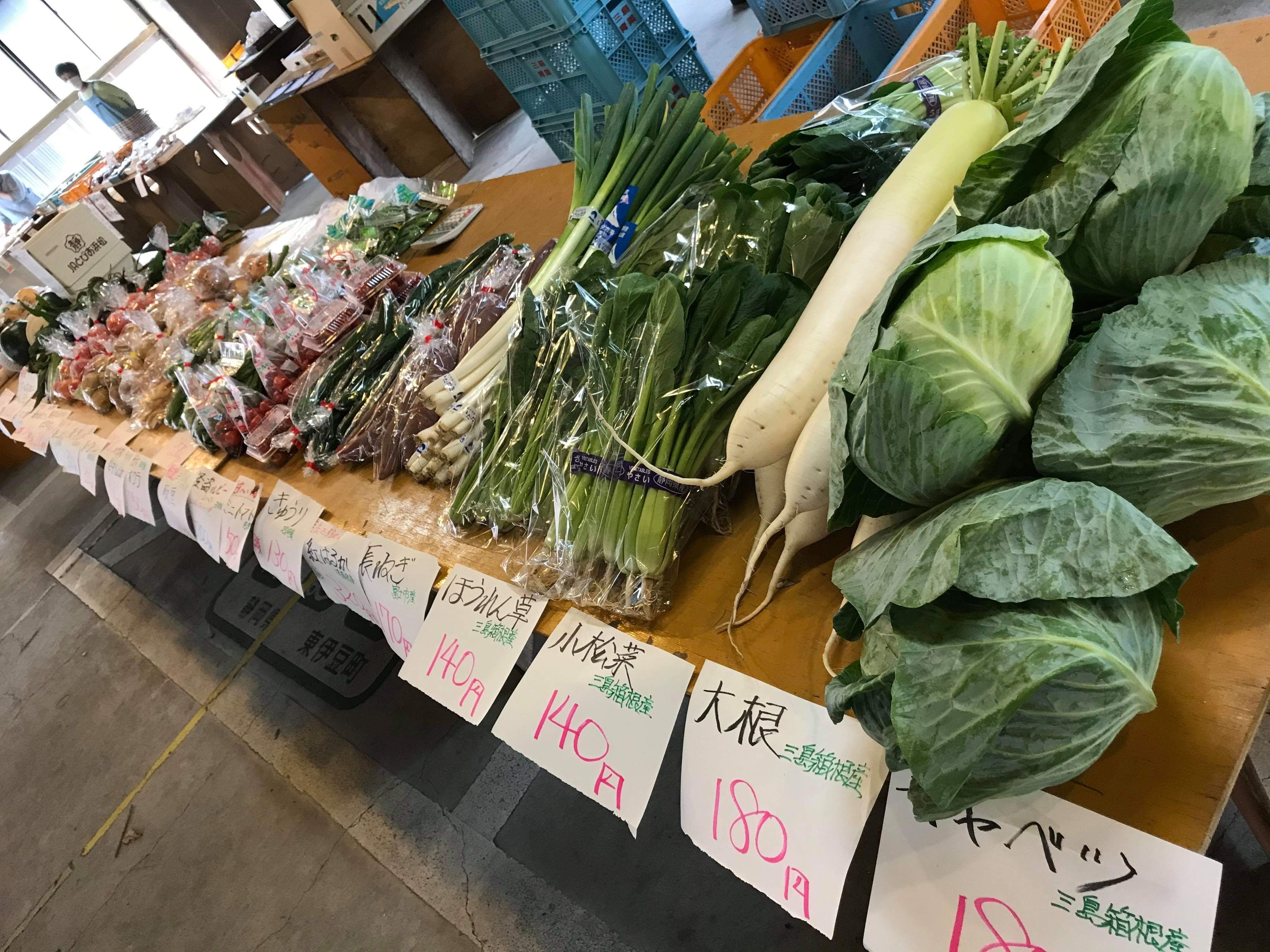 朝市では新鮮なお野菜が並び