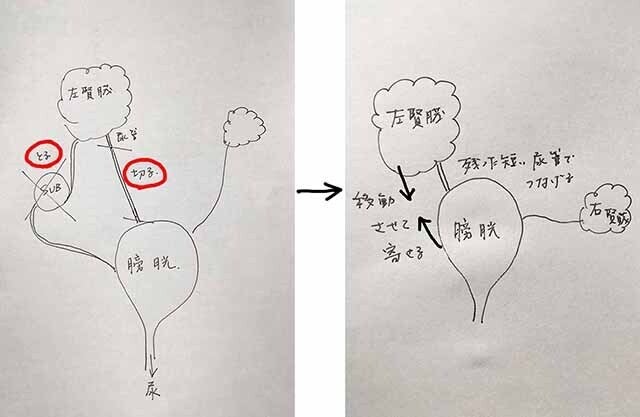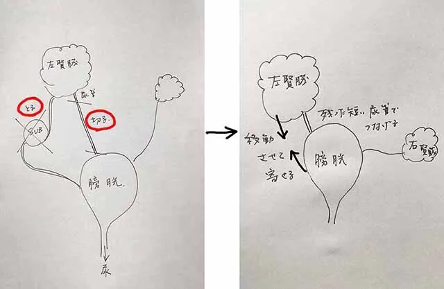 使用できる生きた尿管が短かったため、膀胱を移動し、腎臓に寄せました
