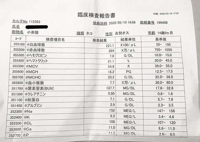 地元から連れてきて、長年共に暮らした長老猫を亡くし、悲しみが癒えぬまだ数日のタイミングで小茶の嘔吐が始まりました。そして、急ぎ検査を受けるために入院したその夜に尿路閉塞が起きてしまいました。