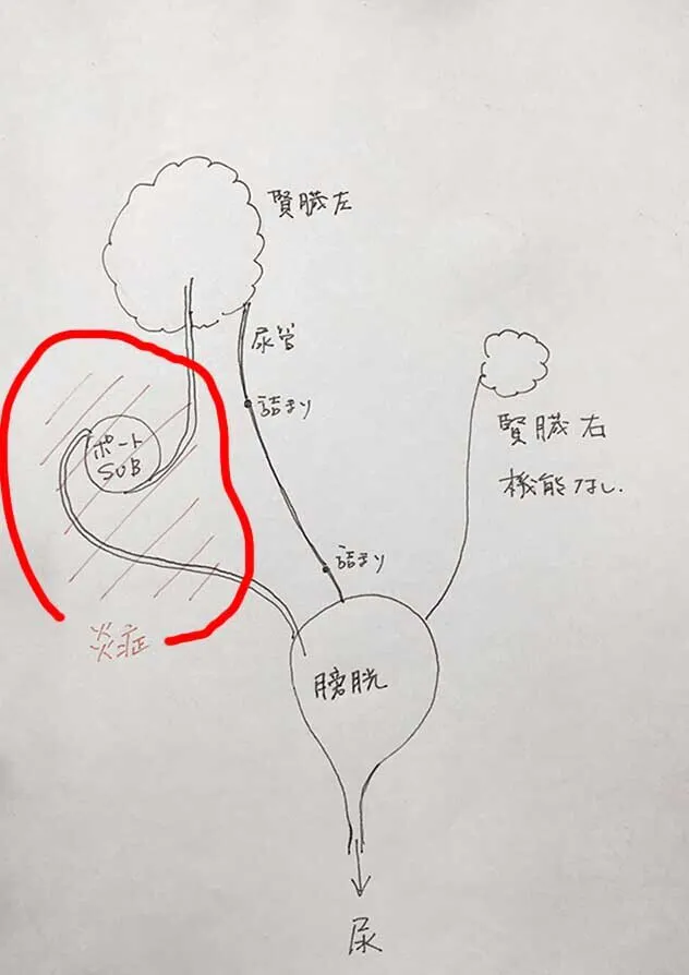 そして、残った尿管は、正常の位置では腎臓と膀胱を繋げないくらい短かったため、膀胱を腎臓に近いところまで移動させ繋ぎなおすと言った、かなり大掛かりで複雑な手術になりました。