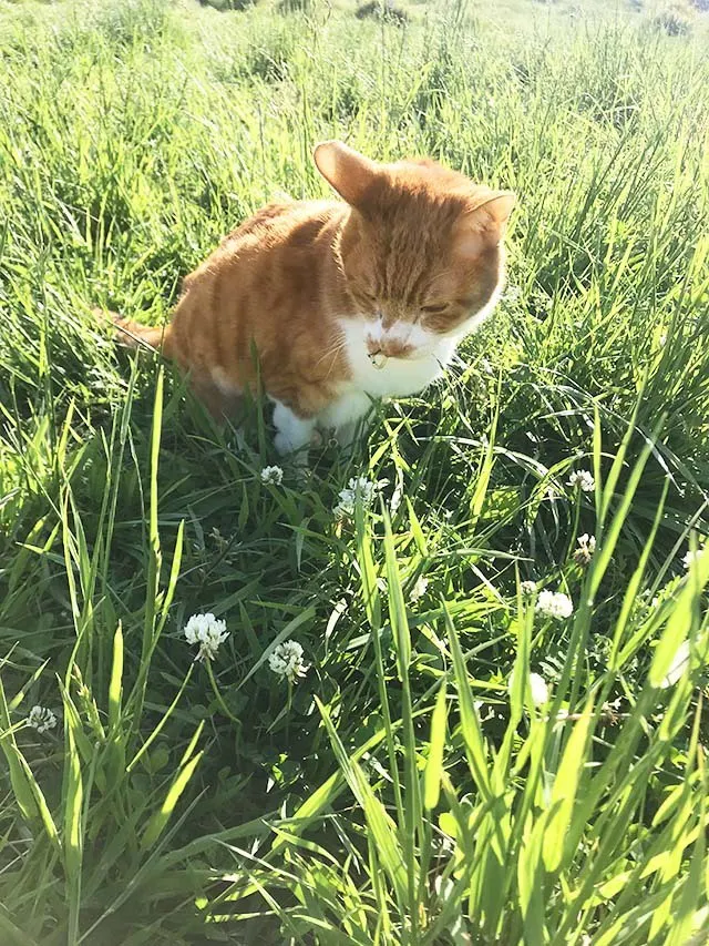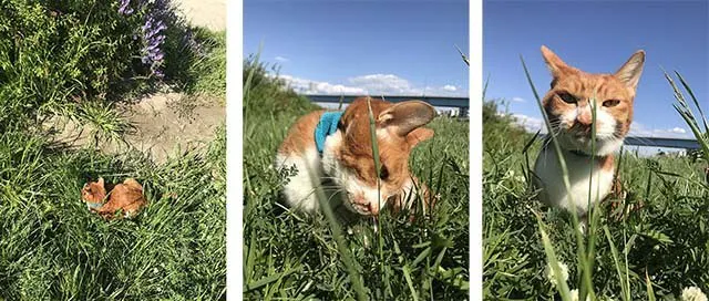 それでも、先日病院の帰り、とても良い天気だったのと、長時間の診察を頑張ったご褒美に、帰り道の原っぱに降ろしてみたところ、いつもはしんどそうに寝ている小茶が、一歩一歩踏みしめるように草の上を歩き、草の匂いを嗅ぎ、風を感じ、お気に入りのポイントを探しスヤスヤと気持ち良さそうにお昼寝までしました。