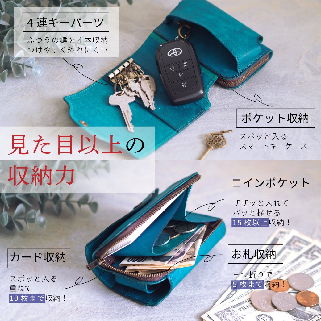キャッシュレス化が益々進む中、ミニ財布のご購入時にお客様からいただいた「キーケースとお財布を一緒にできないですか?」というお声に応えるべく、『持ち歩きたいものをひとつに!』というアプローチで、「スマートキー」「家の鍵」「カード・コイン・お札」がまとめて持ち歩けるアイテムを新たに0(ゼロ)から考えました。