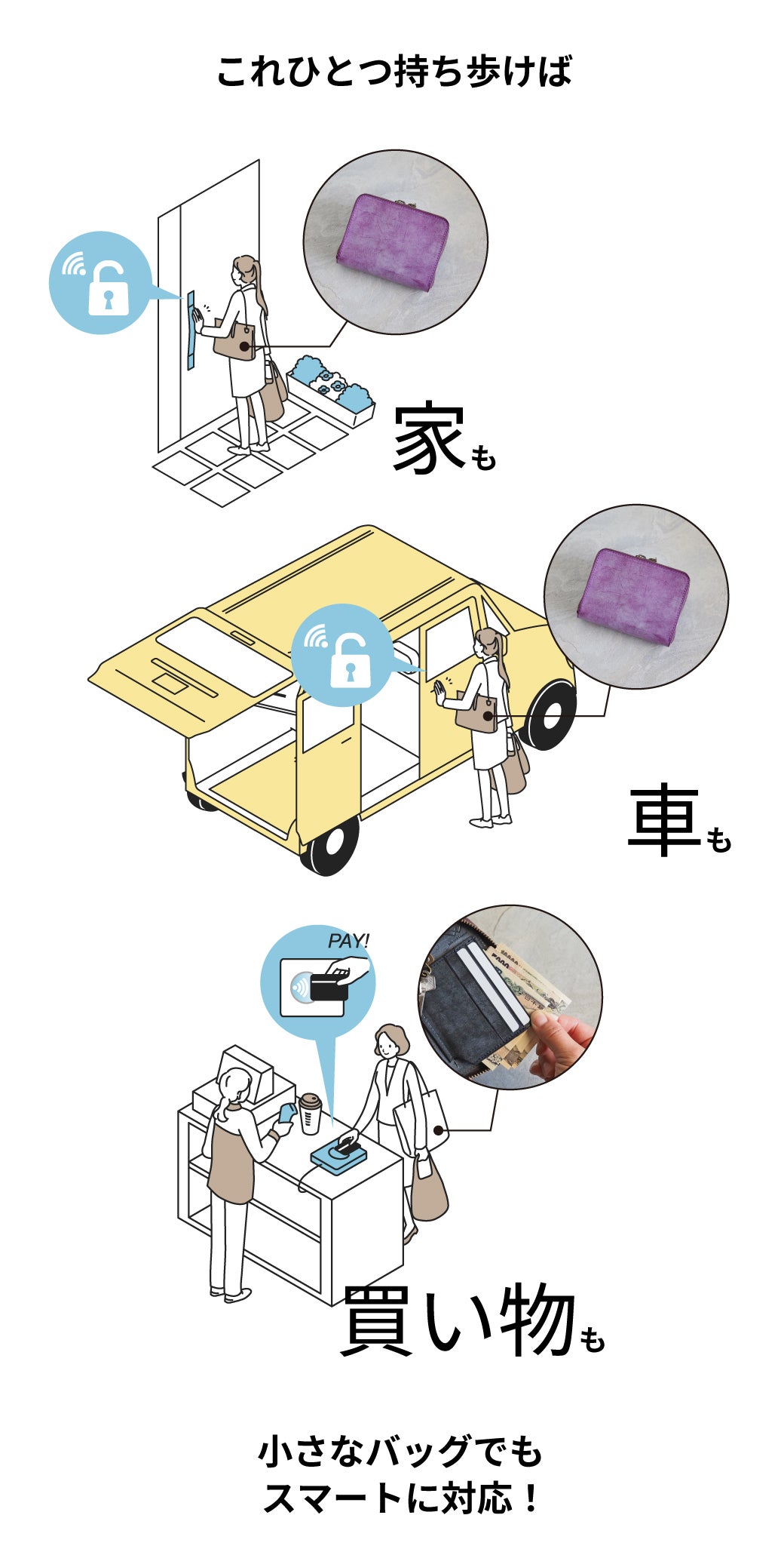 「スマートキー2つ」に「普通の鍵」「カード」「お札」「コイン」と、コンパクトながら必要最低限のものが収納できるから、忘れ物の心配もありません!