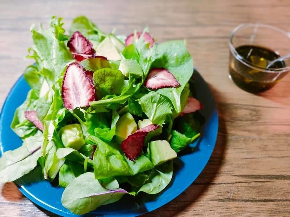 バルサミコ酢のドレッシングをかけていただきます!ドライいちごは薄くスライスされてるから、サラダのトッピングにも相性良しです。
