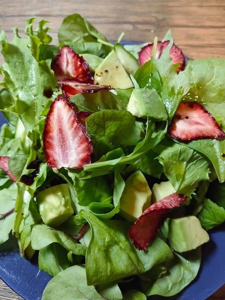 ベビーリーフ、きゅうり、アボカドを混ぜたサラダに レインボーカフェプロジェクト のドライいちごをトッピングしました。