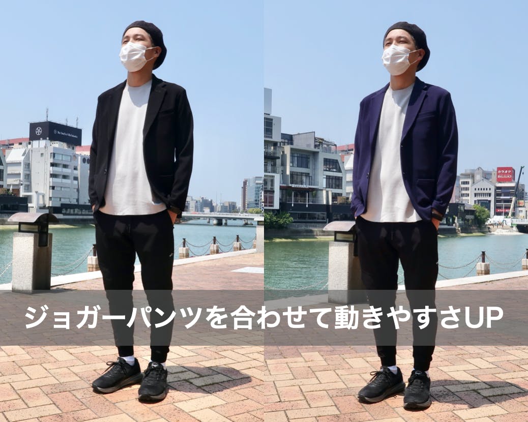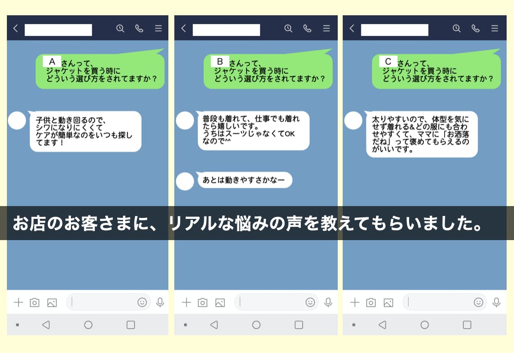 Bさん(40代前半パパさん)「普段も着れて、仕事でも着れたら嬉しいです。うち(の会社)はスーツじゃなくてOKなので^^ 」「あとは動きやすさかなー。」