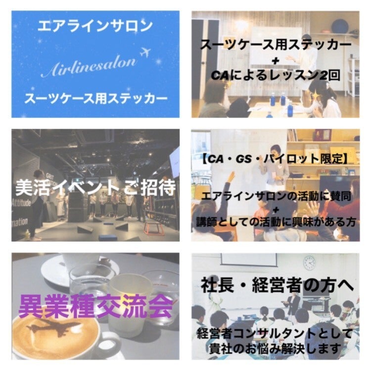 現役CA・元CA、航空関係者の皆さまで、マナー講師 / 語学講師 / 面接対策講師 / ボディメイク / ヨガ・ピラティス / フードコーディネーター などのスキルを活かしたいと考えている方、またはすでに活躍されている方、ぜひ活躍の場を広める機会を作りたいと思っております。(※匿名での活動でも大歓迎です)