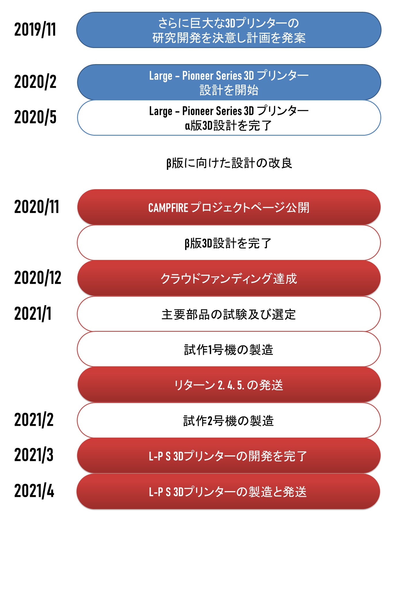 A : 2020年3月から設計開発を始めました。実際に部品を仕入れて実機開発に取り組み試作1号機が製造されるのは2021年の1月を予定しています。リターン品の3Dプリンター本体の発送は2021年4月以降を予定しています。