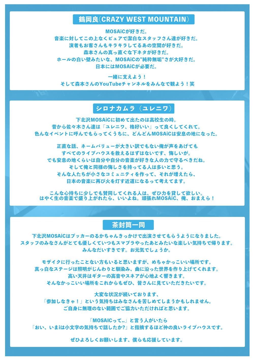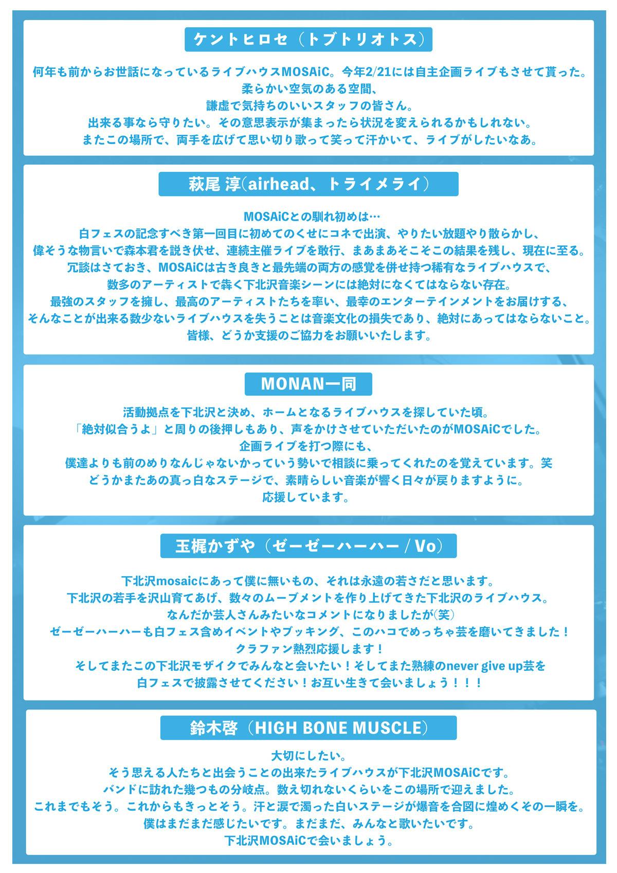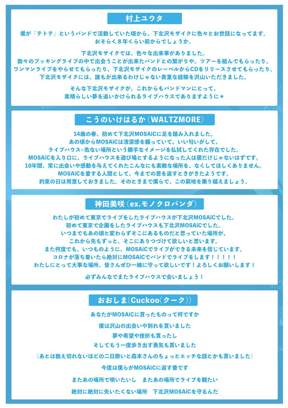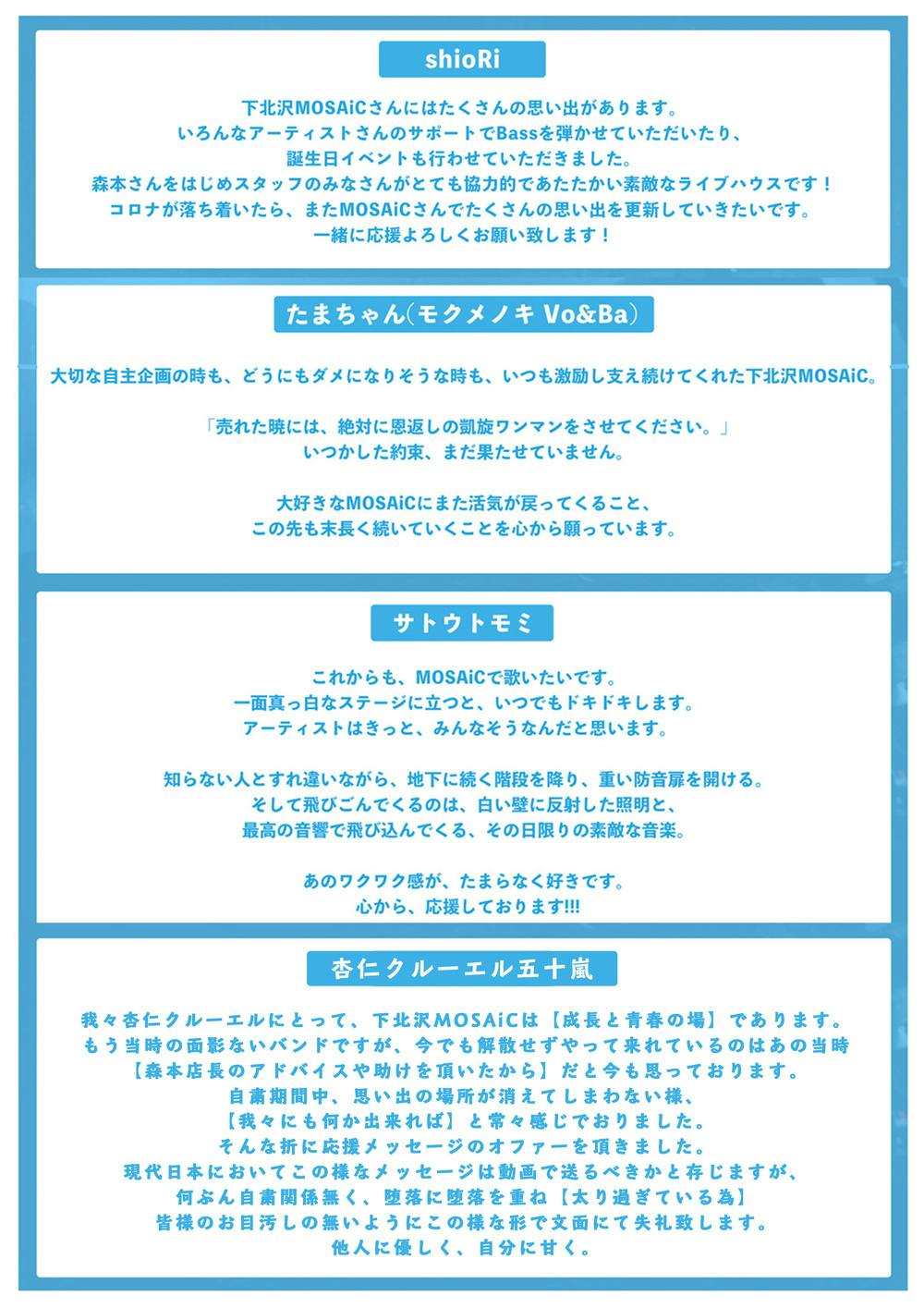 沢山の方々が困難な状況の中、大変心苦しいお願いではありますが、下北沢MOSAiC存続のために、皆様のご支援を心よりお願い申し上げます。