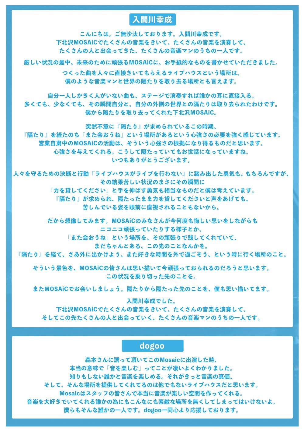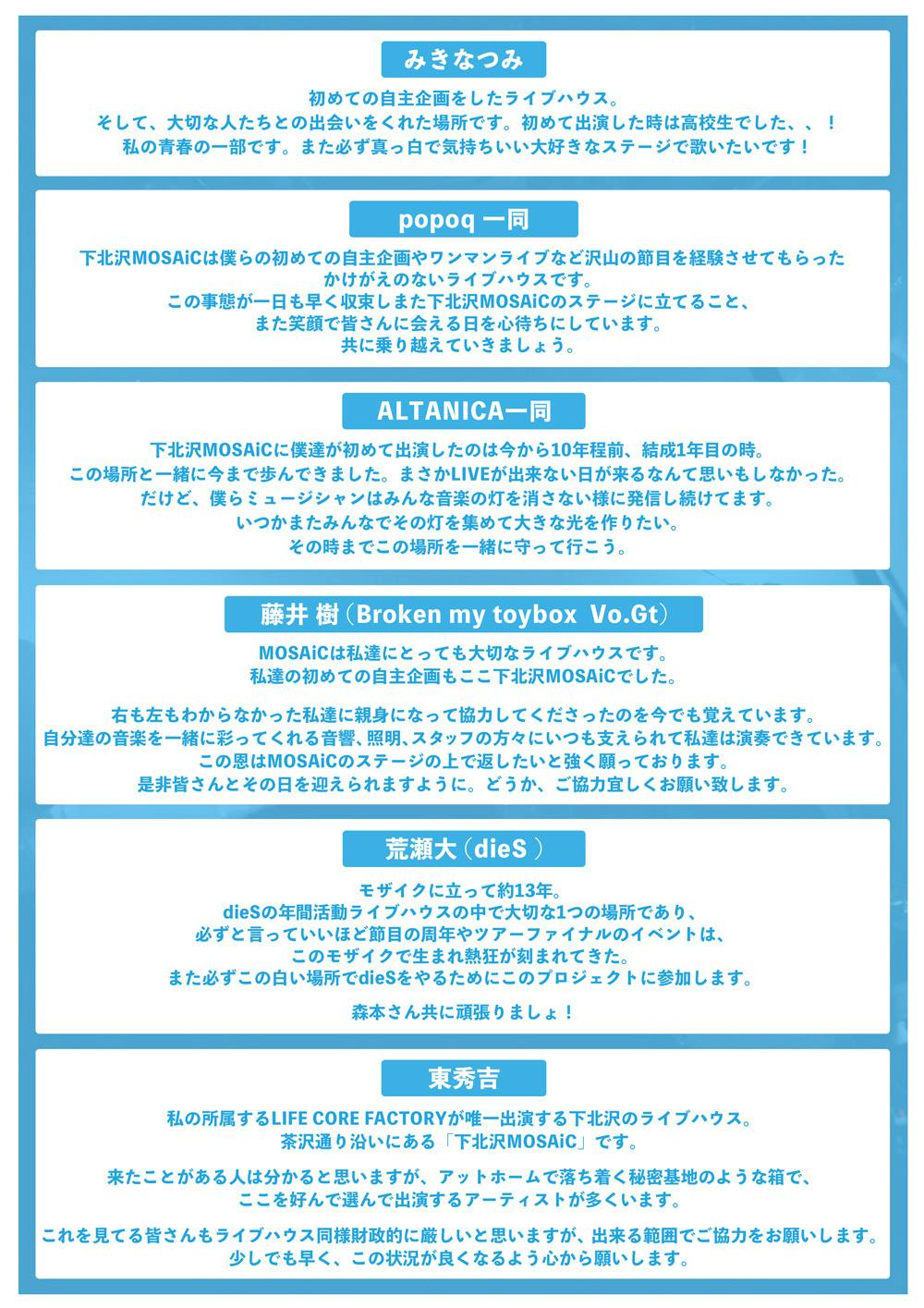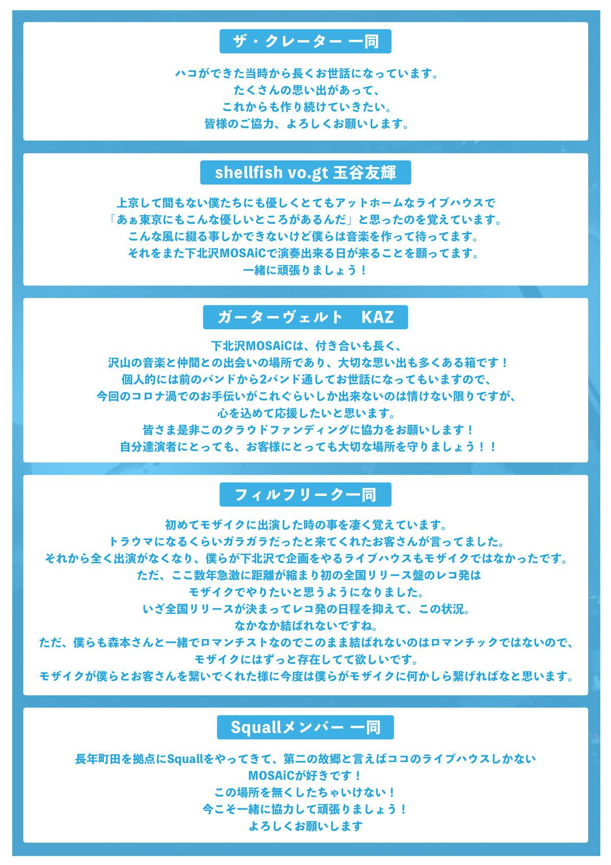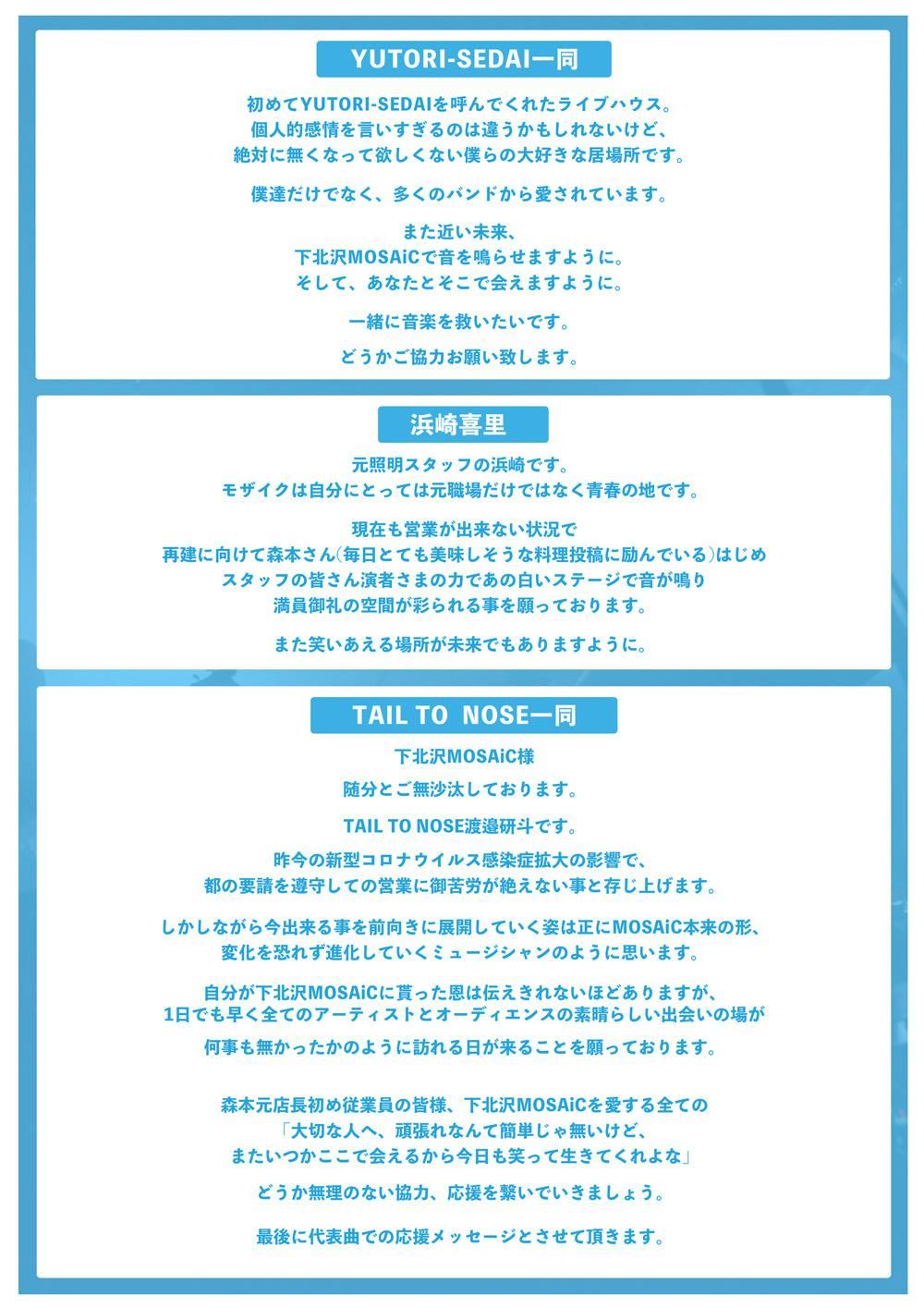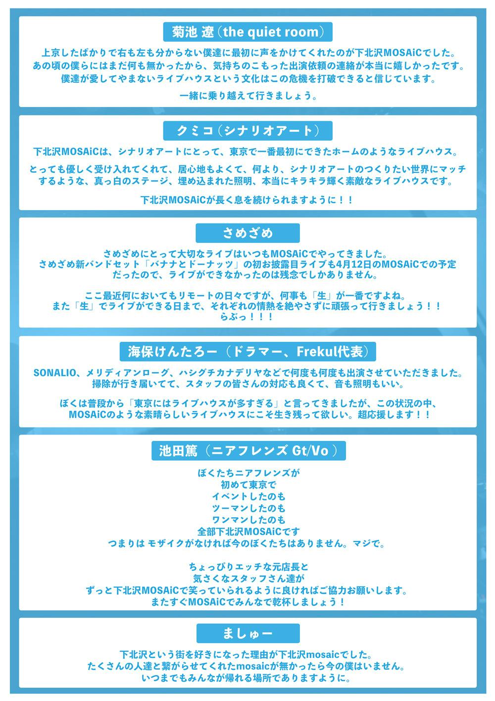 沢山の方々が困難な状況の中、大変心苦しいお願いではありますが、下北沢MOSAiC存続のために、皆様のご支援を心よりお願い申し上げます。