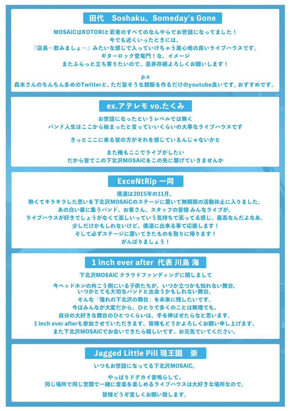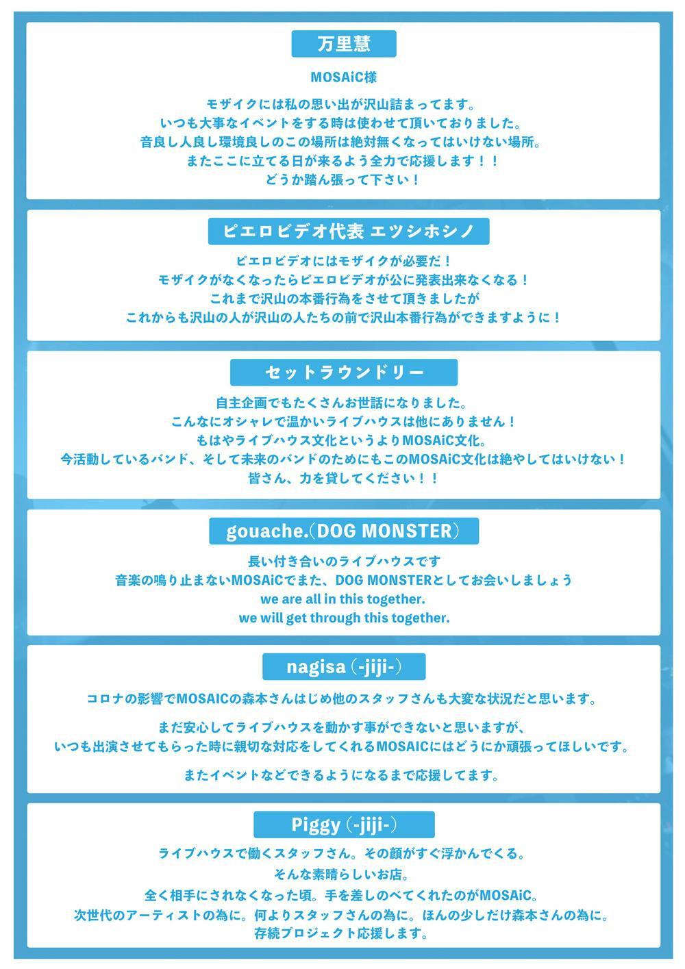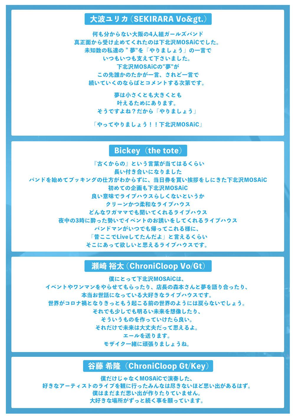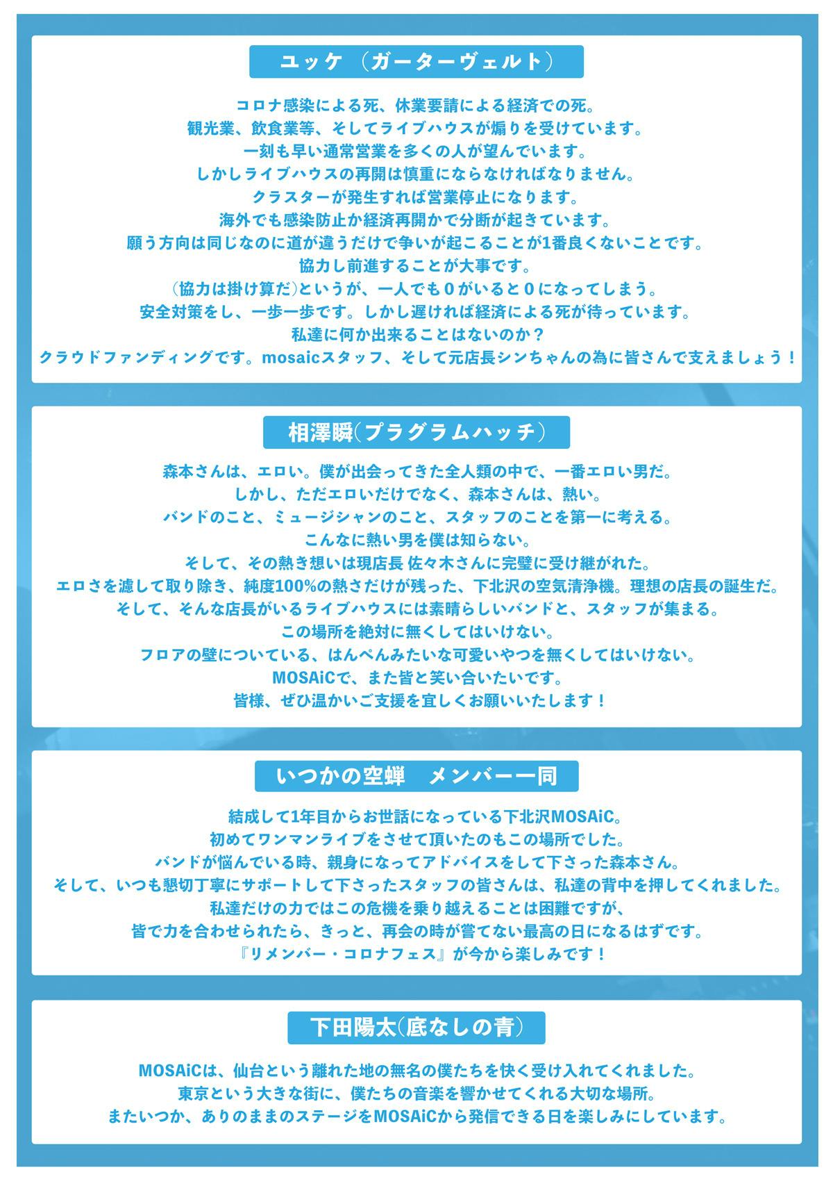 沢山の方々が困難な状況の中、大変心苦しいお願いではありますが、下北沢MOSAiC存続のために、皆様のご支援を心よりお願い申し上げます。