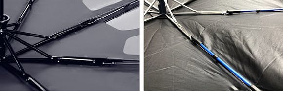 折り畳み傘の骨は強風に負けて折れることが良くありますが、繊維強化プラスチックなら折れることなく元通り。風速110km/hにも耐えることができます。