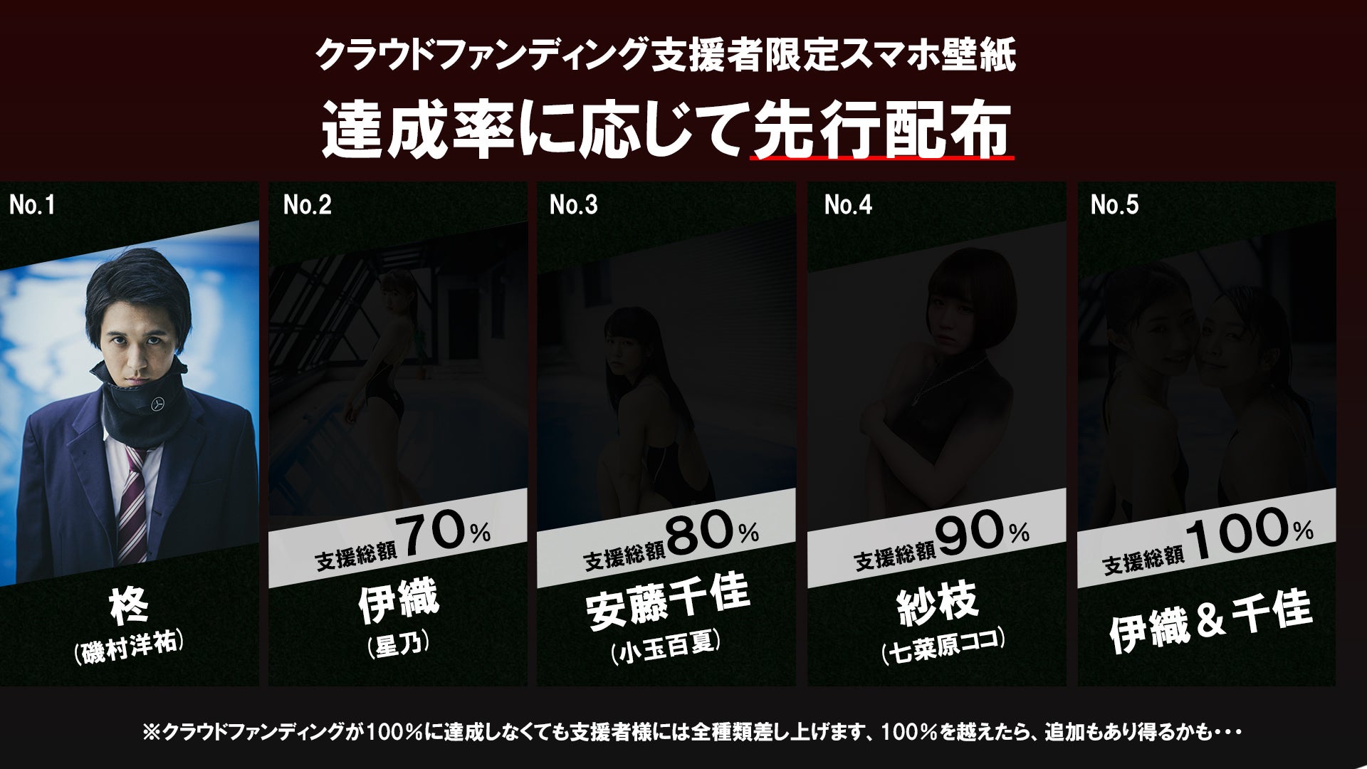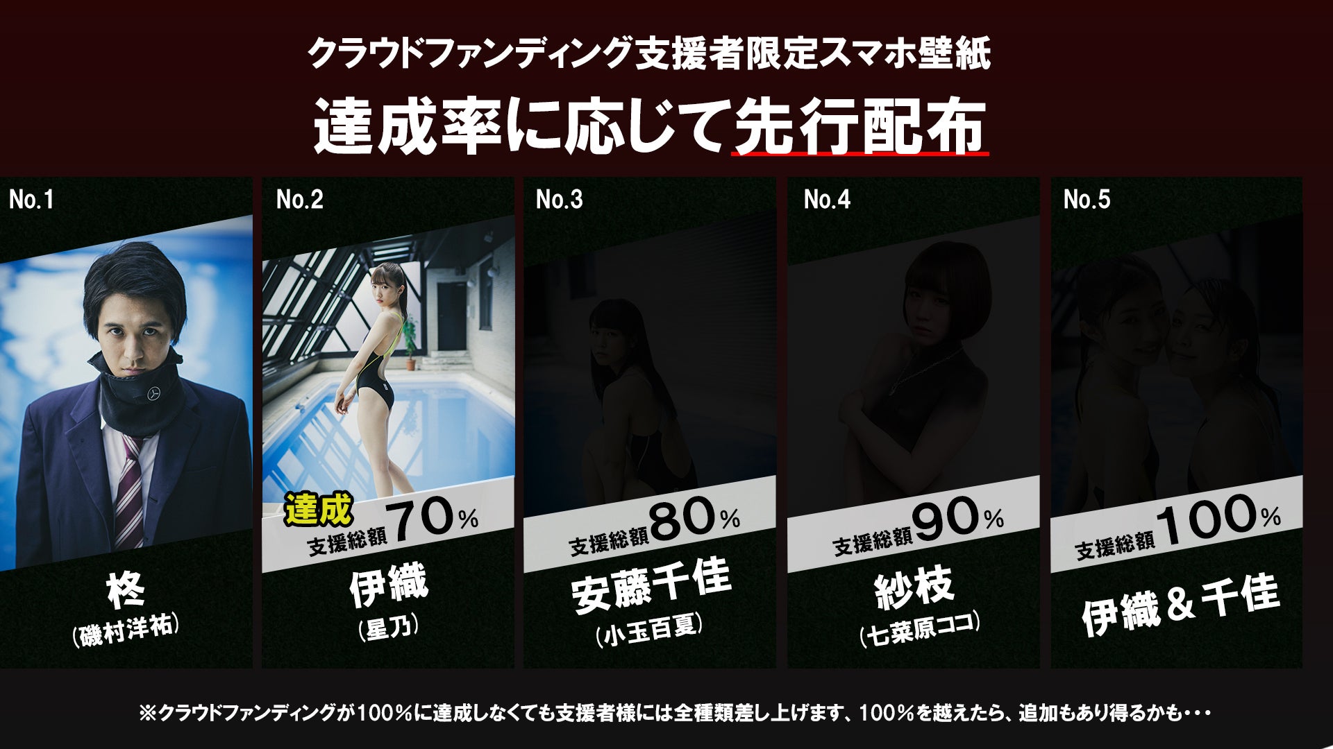 クラウドファンディング支援者にお贈りさせて頂きますリターンの1つ、「スマホ壁紙」ですが、達成率に応じて先行配布する事となっております!もちろん、あくまで先行配布なだけで、100%に達成しなくても全種類差し上げる事はお約束致します・・・が、スタッフ&キャストは全員、100%以上を目指しております!!本日、星乃さん演じる「伊織」スマホ壁紙が配布されます!(支援頂いた方のみが閲覧できる活動報告)ページにて公開致します!