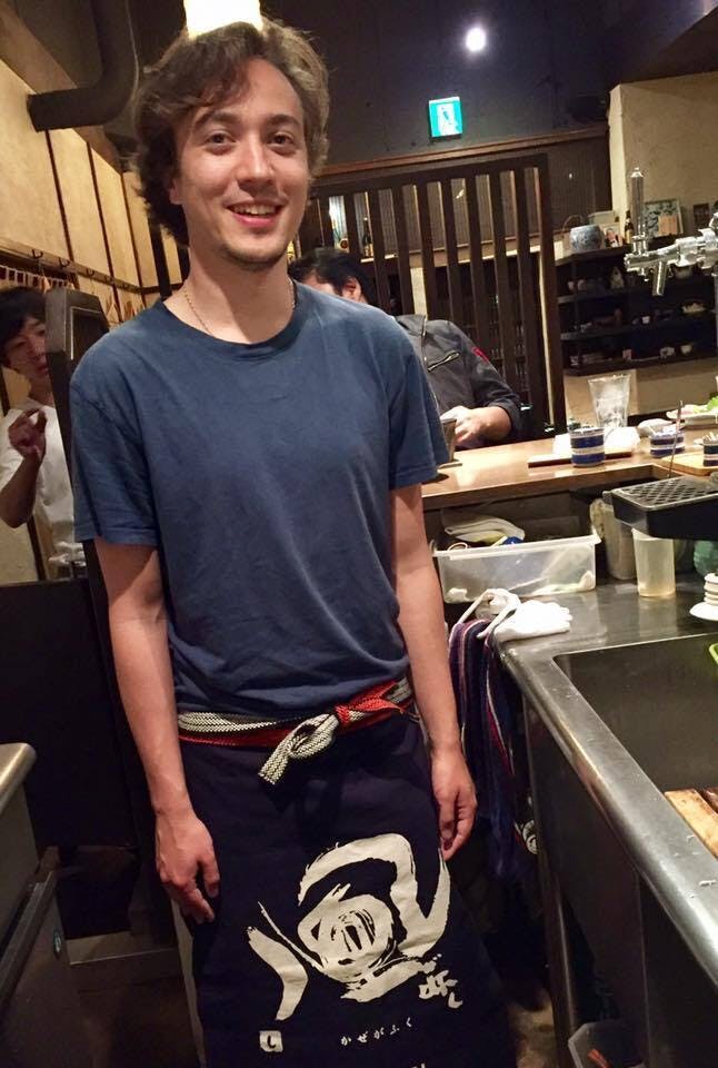 ↓写真は昨日の活動報告でも紹介したJulian君。お客様にいただいた酒蔵の前掛けをつけて店に立ちました(文字通り、「立った」だけです笑)。
