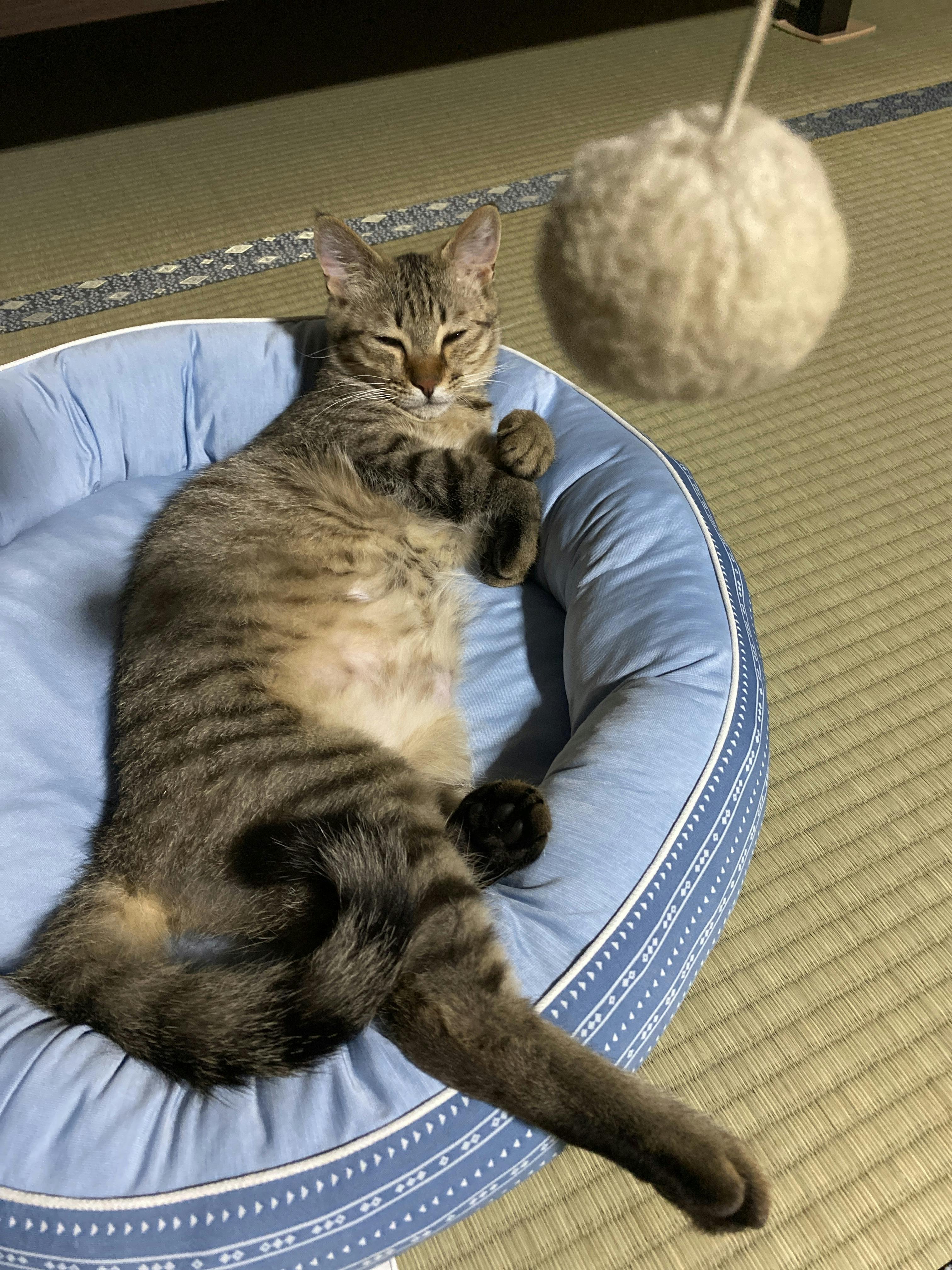 来客にもしっかり応対し、撫でてもらってご機嫌♪おかげで今はご覧のように冷んやりベッドでお休み中です!投薬も頑張りました。