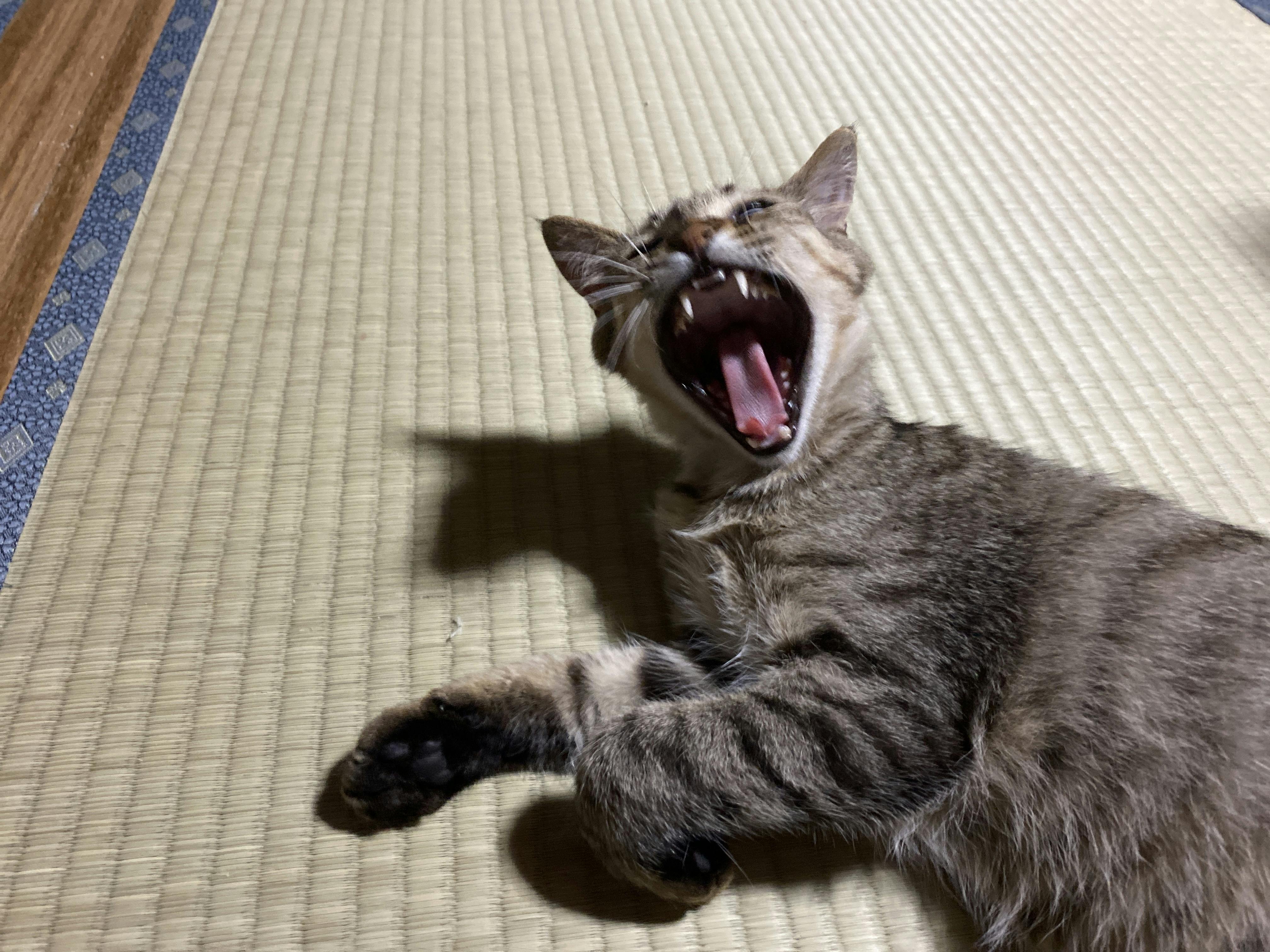 アクビしているきなこ汗