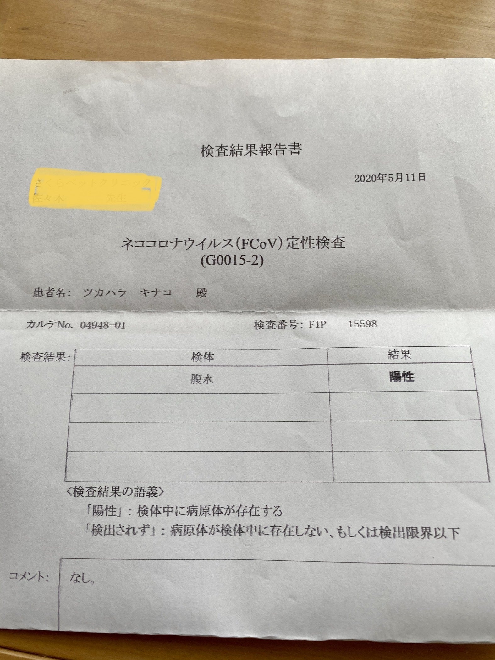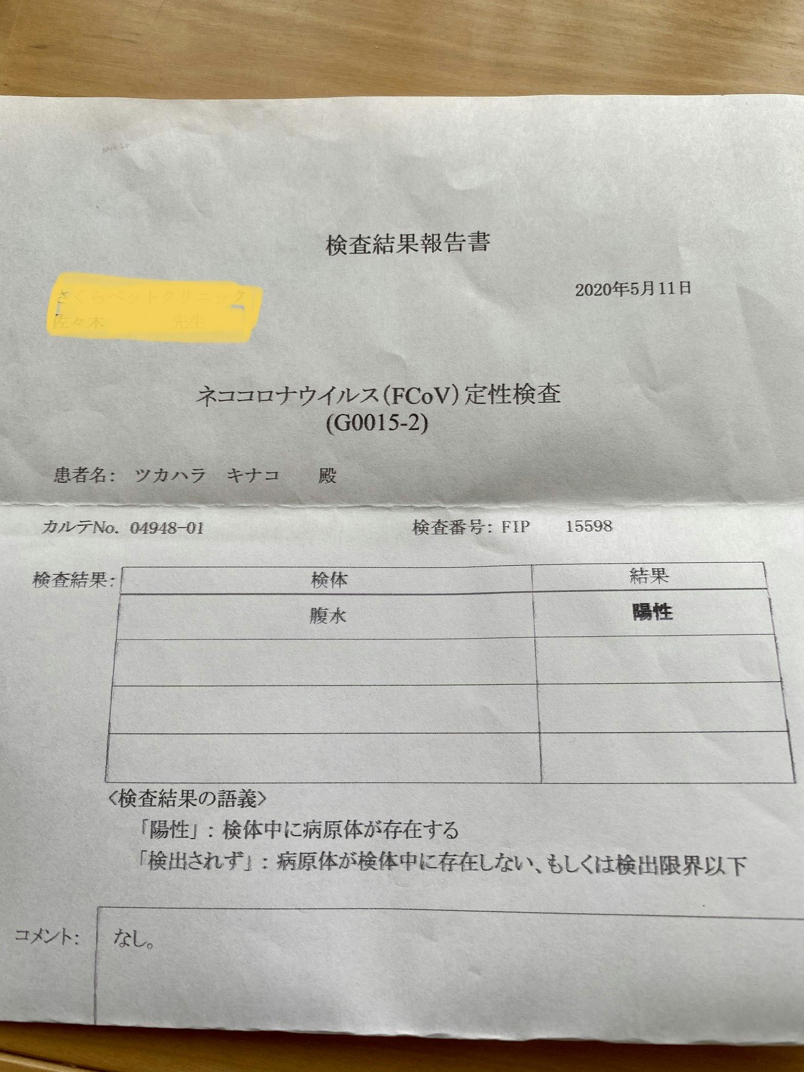 ▲広島の病院で受けた血液検査と腹膜炎(FIP)診断結果