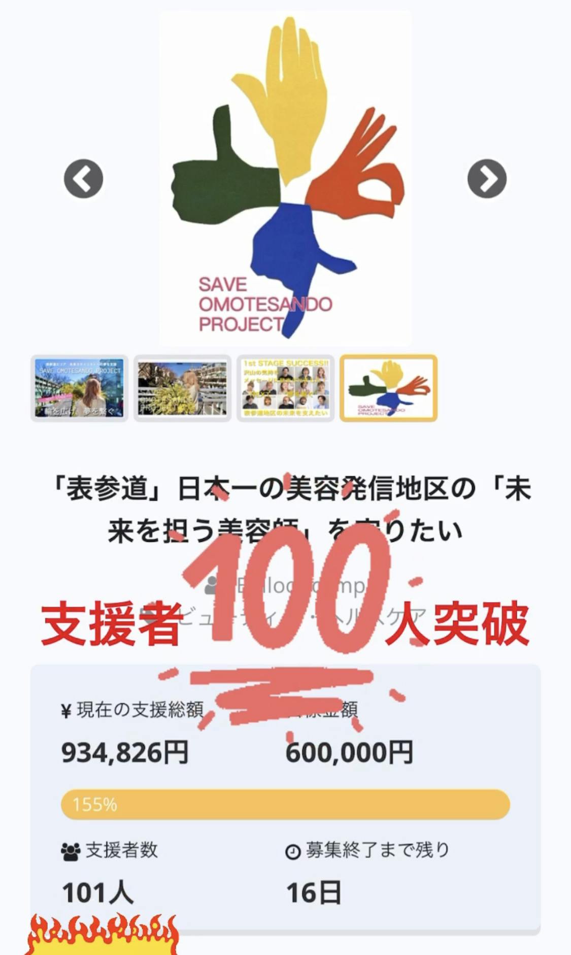 このプロジェクトで大切なお客様や様々な方に知っていただく機会を作り、弊社だけではなく、表参道エリアの美容師達にも『支援の輪を広げて』表参道に恩返ししたいという思いからクラウドファンディングに挑戦する事を決めました。
