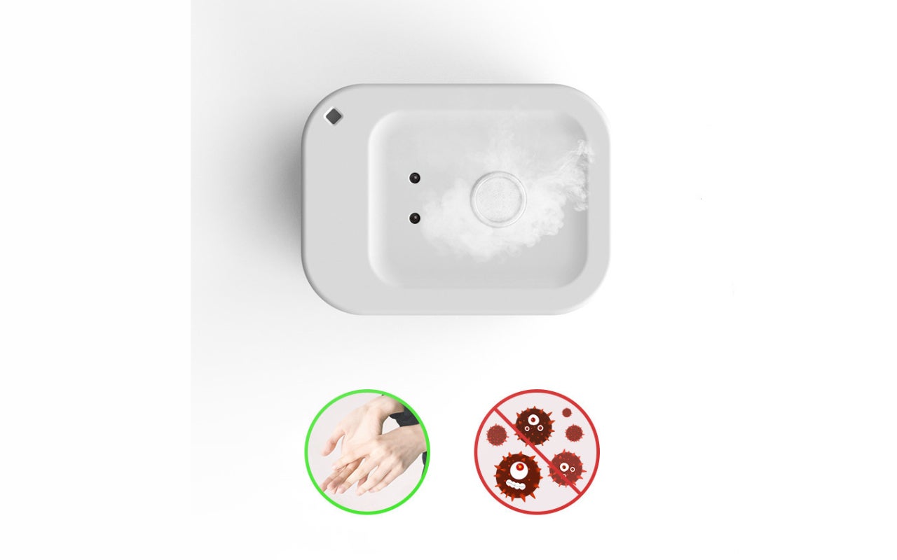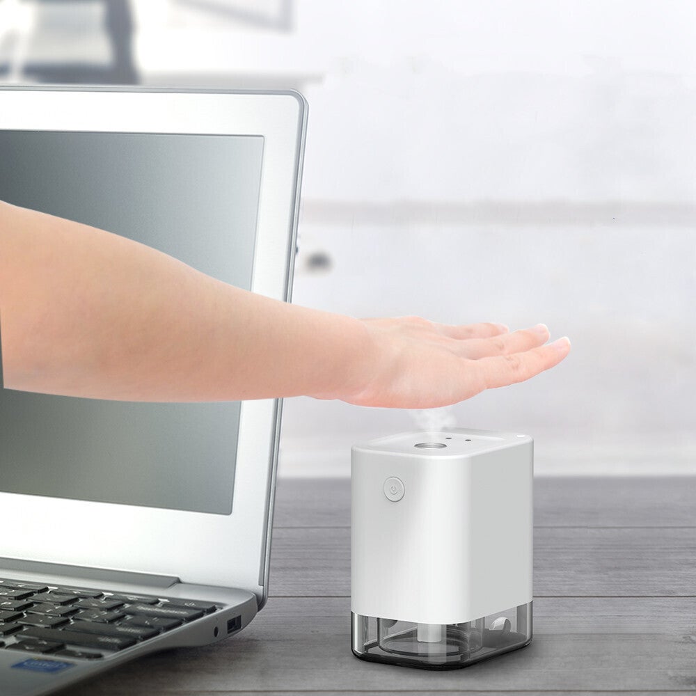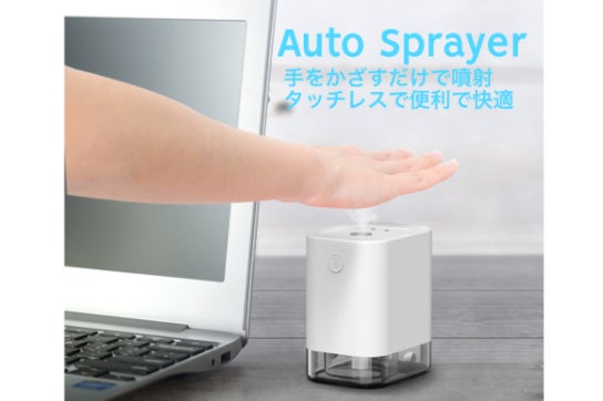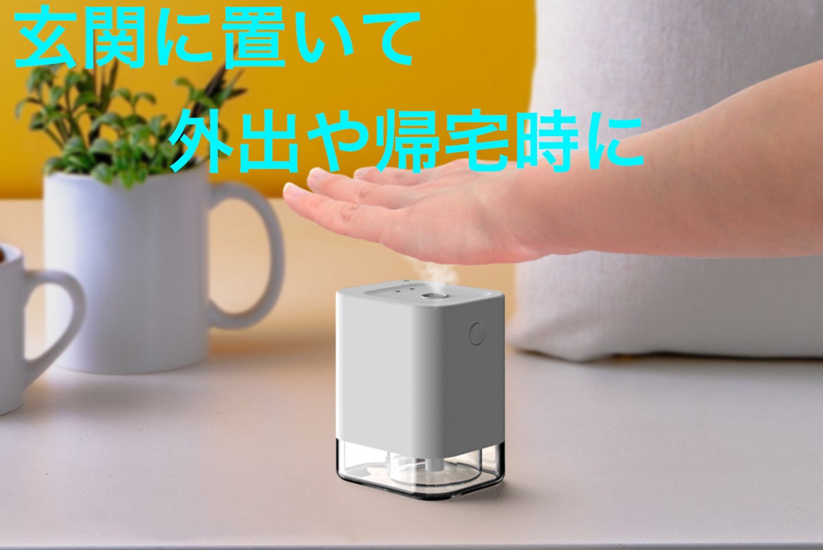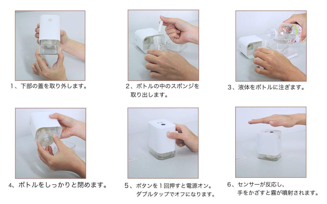 手をかざすだけで中に入れた液体が噴射され、直接ボトルなどに触れずに中の液体を使用できます。