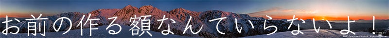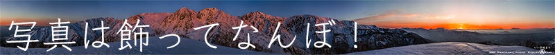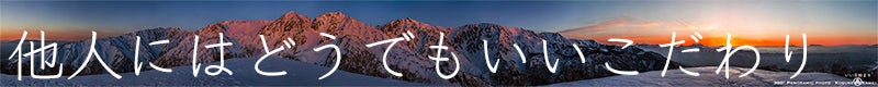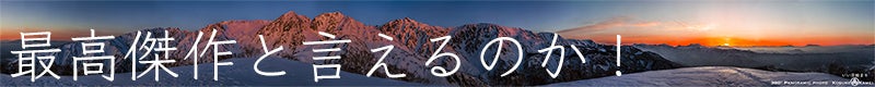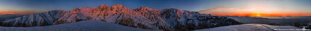 この作品は春先の朝5時半ごろ、東から昇る朝日を受けて西の白馬連峰が赤く染まるモルゲンロートという現象を、白馬連峰の展望台と称される小日向山(おびなたやま)から撮影した360°のパノラマ写真です。写真右(東)側には浅間山や妙高山、火打山などが見渡せ写真左(西)側には北アルプスの名峰が迫ります。この写真を撮るために天候や雪崩の危険性を考慮し、真っ暗闇の中、たった一人星空を頼りに夜中の1時に登山を開始して朝の5時ごろ山頂に着く頃には空が白みかけていて息を切らせながら駆け足で登り、急いでカメラをセッティングし寒さも忘れて朝日を待った、とっても思い入れのある作品です。現場に立ってみないと刻一刻と変化する山の色合いや本物の神々しさ、涙が出るほどに有難い太陽の暖かみは感じられませんが、それが少しでも伝われば本望です。ぜひ手に取ってご覧いただければ また、お部屋に飾っていただければこの上なく幸いでございます。