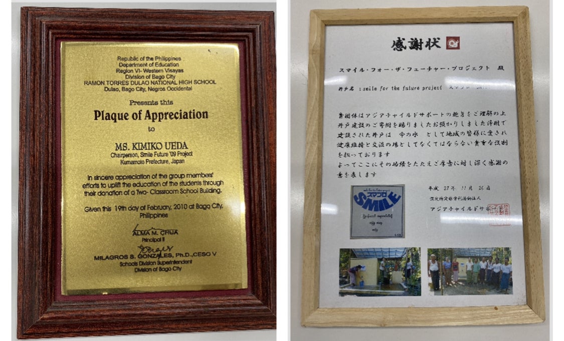 右がフィリピン、左がミャンマーからもらった感謝状です。