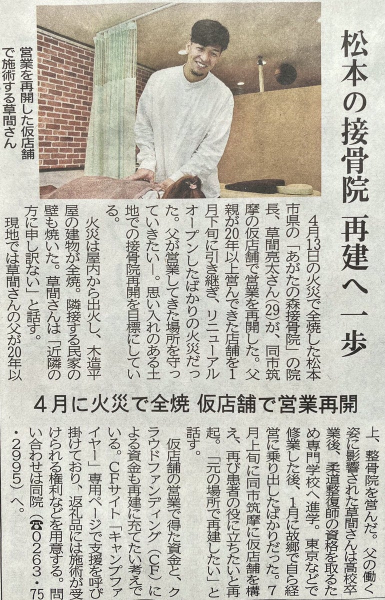 前回のMGプレスさんに続き、今朝信濃毎日新聞さんに草間先生の記事が掲載されました!!現在仮店舗で施術は再開しており、火災前から通っていただいていた患者さんの施術が再開できていてとても嬉しいことです!支援やシェアそしてこのような掲載など、本当にたくさんの方々からのご協力に感謝しています!!是非SNSなどでの拡散などもお願いいたします!そして、このような掲載やご協力は本当にありがたい限りなので、メールや問い合わせなどいただけますと幸いです。みな様引き続き、よろしくお願いいたします!!!ps.僕も草間先生もそのご家族も、皆元気に前向きにやれています!そして皆様からのコメントも全て読んでおります!!ありがとうございます!!