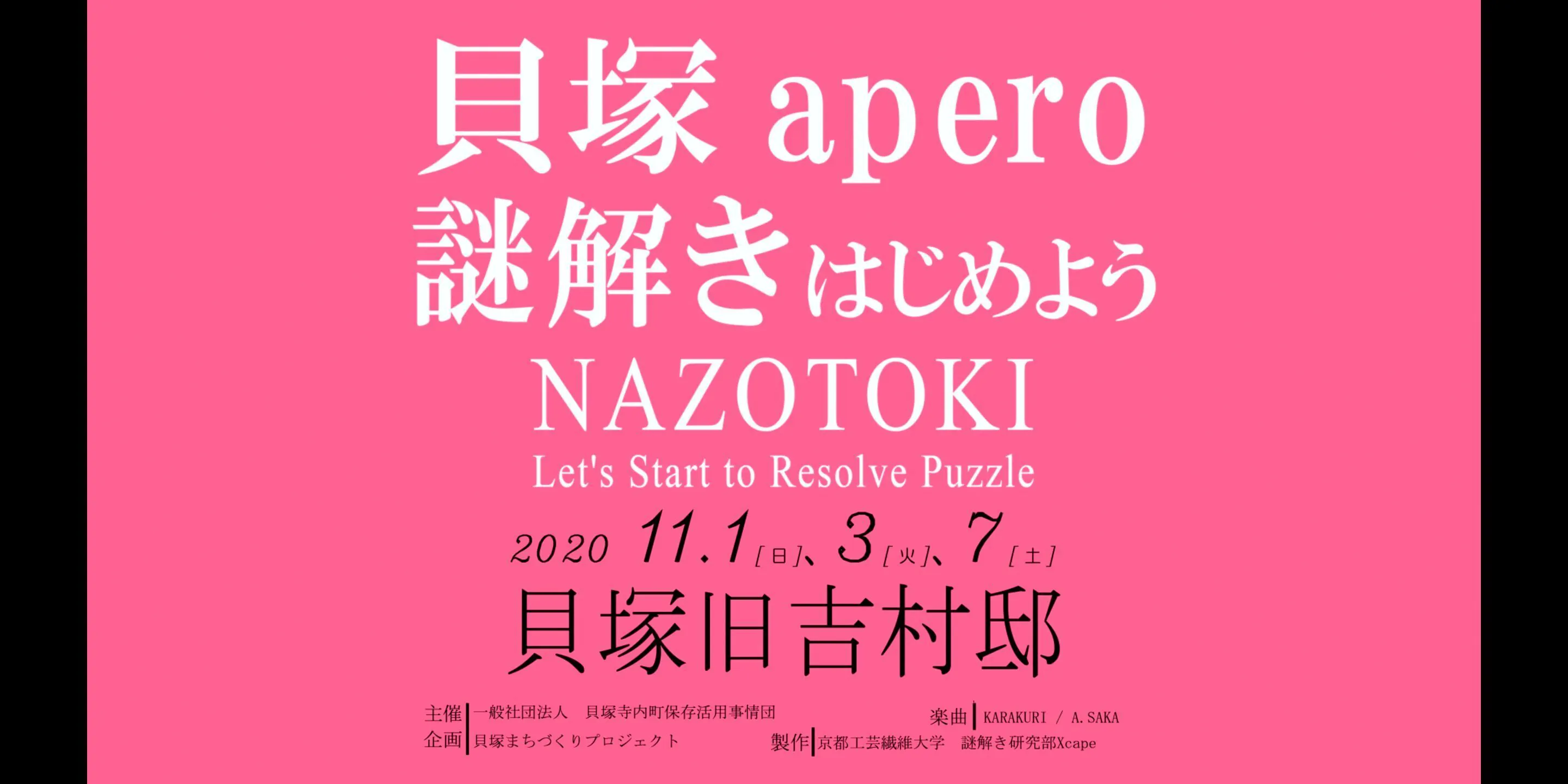 2020/10/27 20:07ご縁があり大阪の貝塚で開催される地域イベントにコンテンツ協力しています!!重要文化財の町家「旧吉村家住宅」を活用して行われる【貝塚apero#3】では、地域の方と交流する場が設けられています。また、お子さんでも楽しめるワークショップやその他ハンドメイドの出店などもあり、貝塚の魅力に触れられるイベントとなっています。Xcapeは、そのイベントで吉村謎解きゲーム(貝塚apero#3オープニングmovie)のほか、貝塚まち紹介ムービー等(まち紹介ムービー)も製作しています。まちのちょっとした発見や歴史の名残を感じれる内容となっています。謎解きは、子どもでも参加できるように製作しています。もちろん、大人の方でも十分楽しめると思います。日にち;2020/11/1,3,7場所;大阪府貝塚市 旧吉村家住宅主催;貝塚まちづくりプロジェクト後援;一般社団法人 貝塚寺内町活用事業団お時間を見つけていらしてくださいね!こうして、地域活動にも参加するすることができ、更によりデザインにも力を入れて活動できるのは、皆さんの御陰です。今回の映像製作では、有料ソフトadobeを使って編集することができました。この先も、京都工芸繊維大学の強みと言えるデザインにも力を入れていきたいと考えています。https://twitter.com/_X_c_a_p_e_/status/1320943455627952128?s=20Twitterやインスタグラム、Facebookなどにも記載しています。良かったらリツィート・共有していただけると嬉しいです!!!こたえの確認は、貝塚の動画に出てくるのでチェック! もっと見る