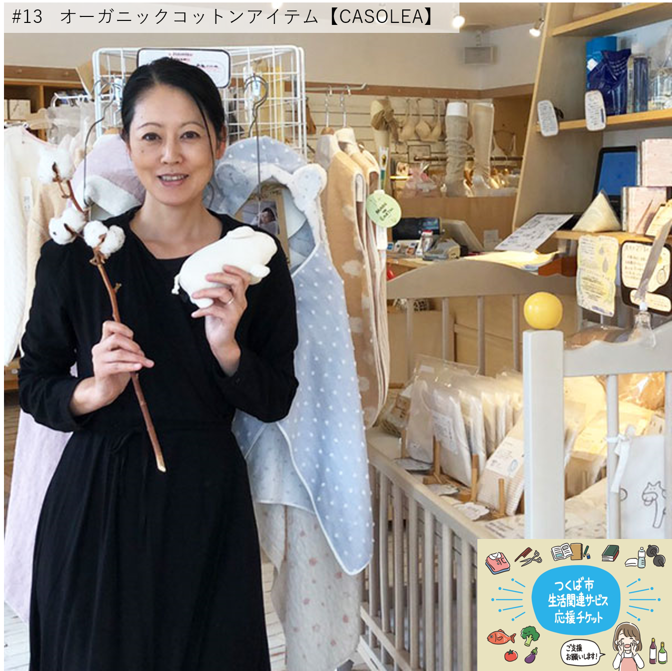 引き続きご支援をいただきありがとうございます。本プロジェクトに参加していただいている事業者様の紹介を行っています。第13回目は、つくば市二の宮にあります「オーガニックコットンアイテム【CASOLEA】」さんです。1.いつからどのような想いで営業しているかCASOLEAは2006年11月から、つくば市二の宮でオーガニックコットン専門店としてベビーギフト・タオル・Lady'sインナー・パジャマ・優しい靴下などのお取り扱い。より安心して製品をお使いいただくために、日本製にこだわった厳選された品揃えです。2.コロナの影響私達のお店は、ベビーギフトの販売もしていますので、コロナの影響はとても切実なものでした。「会いたいけど、会えない・・」「大好きだから、会わないようにする・・」という状況の中、出産のお祝いの多いギフトのお客様は減ってしまいました。3.人気商品の紹介 オーガニックコットンとは・・3年以上、農薬や化学肥料を使用していない畑で有機肥料を使い枯葉剤などを使う事なく育てたコットンのことを言います。そんな肌に優しい素材は、ベビーギフトにとても人気があります。赤ちゃんが産まれて初めて袖を通す時、オーガニックコットンの優しい肌触りをギフトにしてみませんか。 4.ひとことメッセージこれからの気温上昇の季節にオススメの、「4重ガーゼの立体マスク」organic cotton 100%ふわふわなガーゼ素材の着け心地がたまりません!何度でも洗える!そして洗えば洗うほどに柔らかくなっていく風合いを感じて見ませんか?5.店舗情報店名 オーガニックコットンアイテム【CASOLEA】住所 〒305-0051茨城県つくば市二の宮1-1-10TEL 029-861-7752FAX 029-886-8867 Email info@casolea.jp営業時間 9:30~17:30 / 定休日 なし お盆・年末年始のみホームページ:http://www.casolea.jp/オンラインショップ:http://casolea.ocnk.net/6.店舗におけるチケット用途の制限なし<支援方法><チケット購入時の注意><チケット購入はこちらから!>また、以下の2つのクラウドファンディングも実施中です!こちらも合わせてよろしくお願いいたします。▶つくば市で実施するプロジェクトの紹介●新型コロナウイルスに負けない!筑波山観光地応援プロジェクト ※終了期間まであとわずかです!! ご支援をお願いいたします。https://readyfor.jp/projects/tsukubasan-ouen●新型コロナウイルスに負けない!つくばの旅客運送業応援プロジェクトhttps://camp-fire.jp/projects/view/292476