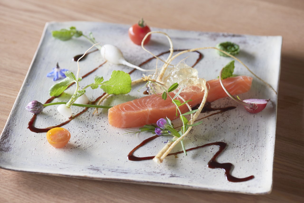 例えば、高橋渓流さんがアルプスの天然水で育てた信州サーモンを使ったスモーク・サーモン。25年間、無農薬野菜を作り続ける野村農園さんのすごい野菜を使ったポタージュ・スープ。スイカやリンゴを食べて、のびのびと育った安曇野放牧豚を使ったコンフィ。