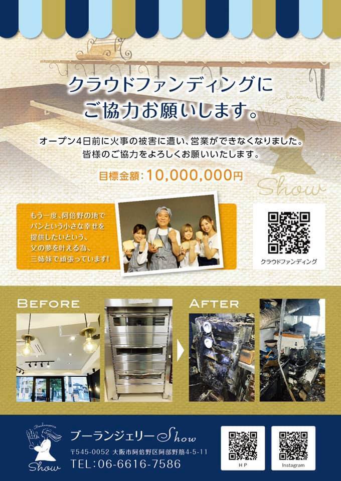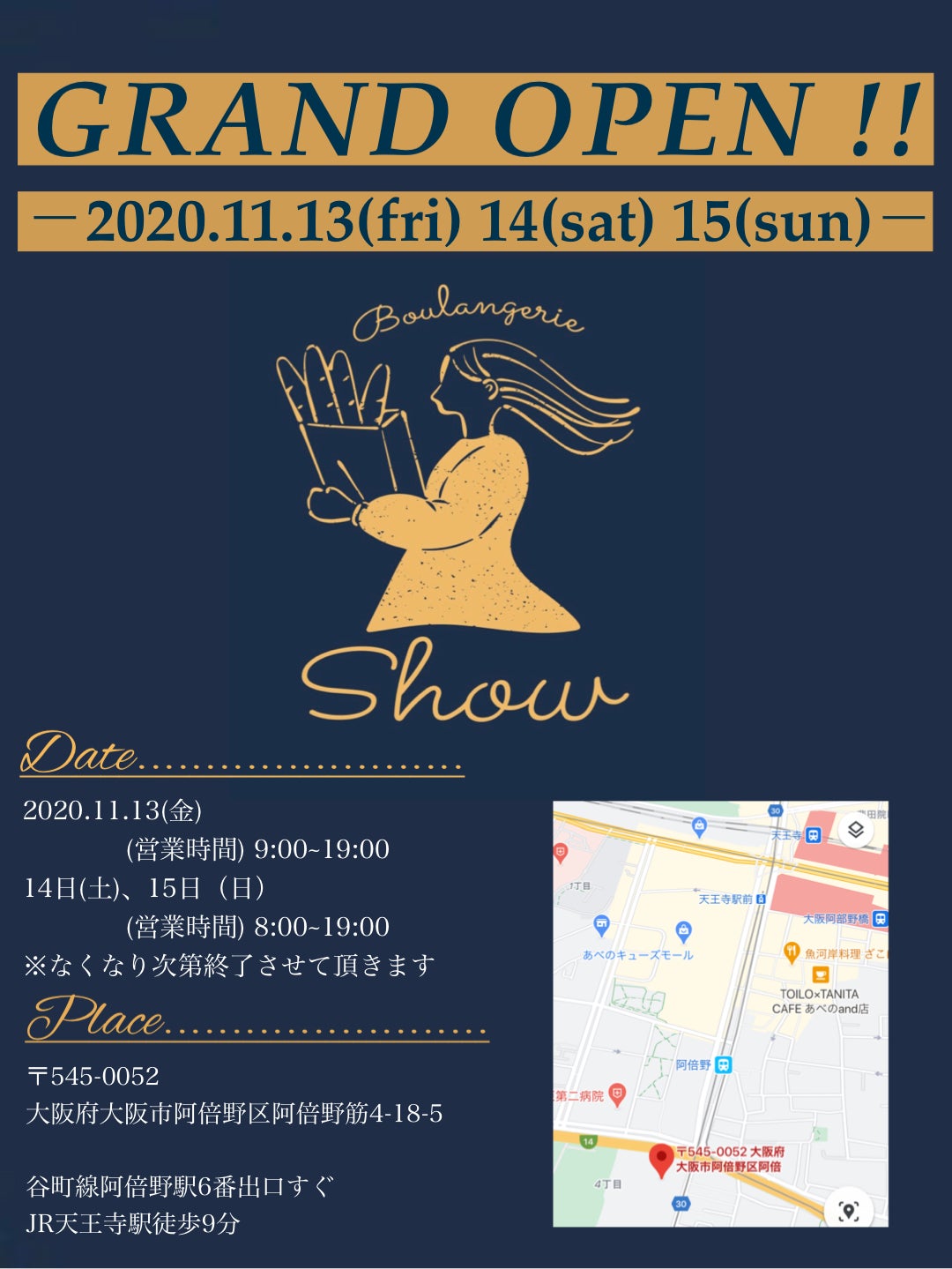 2020/10/08 21:43!!GRAND OPEN!!2020年11月13日(金)・14日(土)・15日(日)(営業時間)13日(金) 9:00~19:0014日(土)15日(日) 8:00~19:00※なくなり次第終了させて頂きます。焼失してから約半年。やっと、やっとオープンできる目処が立ちました!!最初はもうオープン出来ないと思っていました。でも皆様から毎日届いた沢山の温かい応援メッセージ。もう一度、立ち上がろう!と家族一致団結!!最後まで諦めず行動して本当に良かったです!心より感謝申し上げます。これからがスタート!!皆さまに笑顔になって貰えるようなパンをお届け致します♪【Boulangerie Show】〒545-0052大阪府大阪市阿倍野区阿倍野筋4-18-5 もっと見る