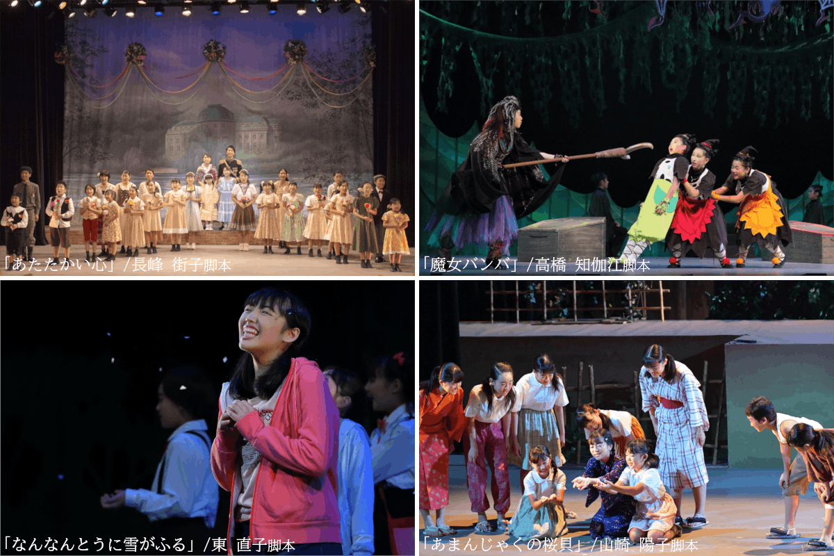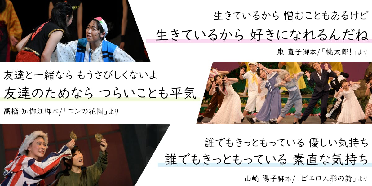 劇団で上演される演目は全て、「愛とやさしさ、思いやり」をテーマにしたオリジナル作品。子ども達は、講師の指導のもと、作品テーマや個々に与えられた役柄に対する理解を深め、仲間達と明るく楽しい舞台を創り上げていきます。