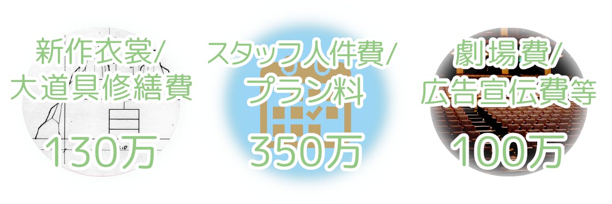 今年の公演の為、衣裳製作費・大道具修繕費など130万円、スタッフの人件費や各種のプラン料に350万円、劇場のキャンセル料や広告宣伝費などで100万円が計上され、そのうち、早急の支払いが450万円にもなっています。来季の公演のために避けて通れない厳しい現実が待ち受けています。