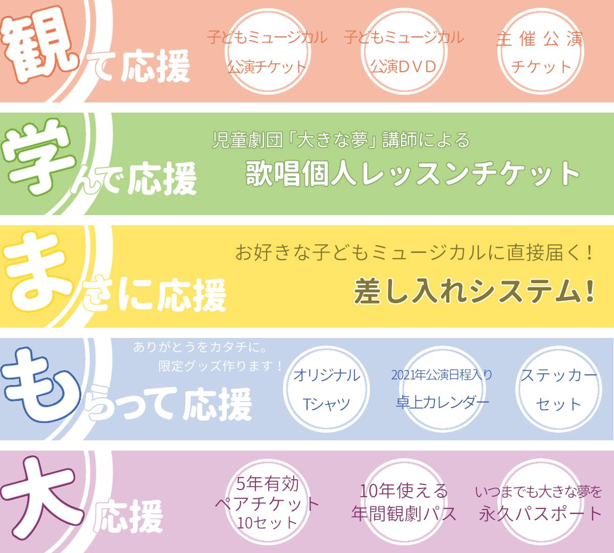 ・リターンに含まれる映像・音源ならびにすべての著作物に関する権利は、児童劇団「大きな夢」に帰属いたします。私的利用の範囲外でのご利用はご遠慮ください。